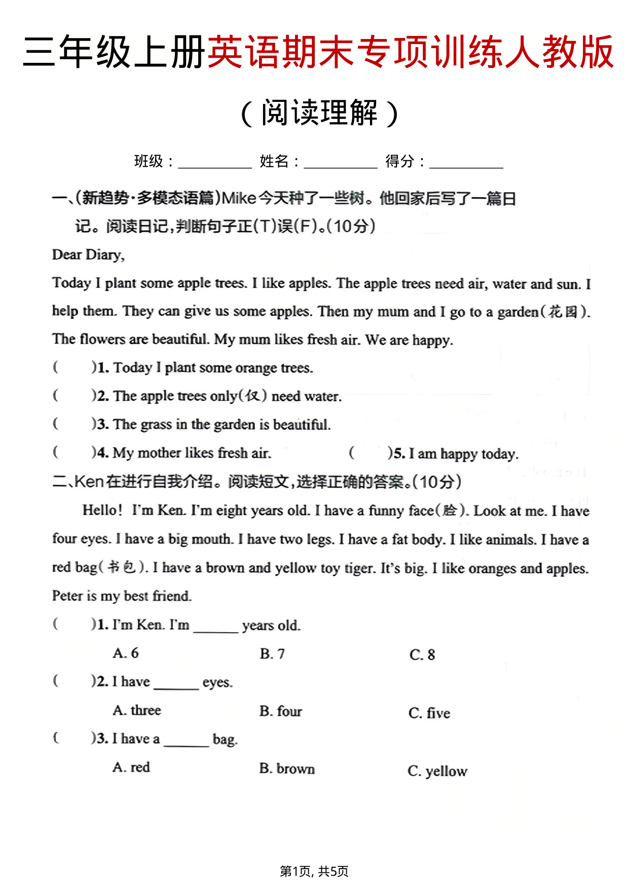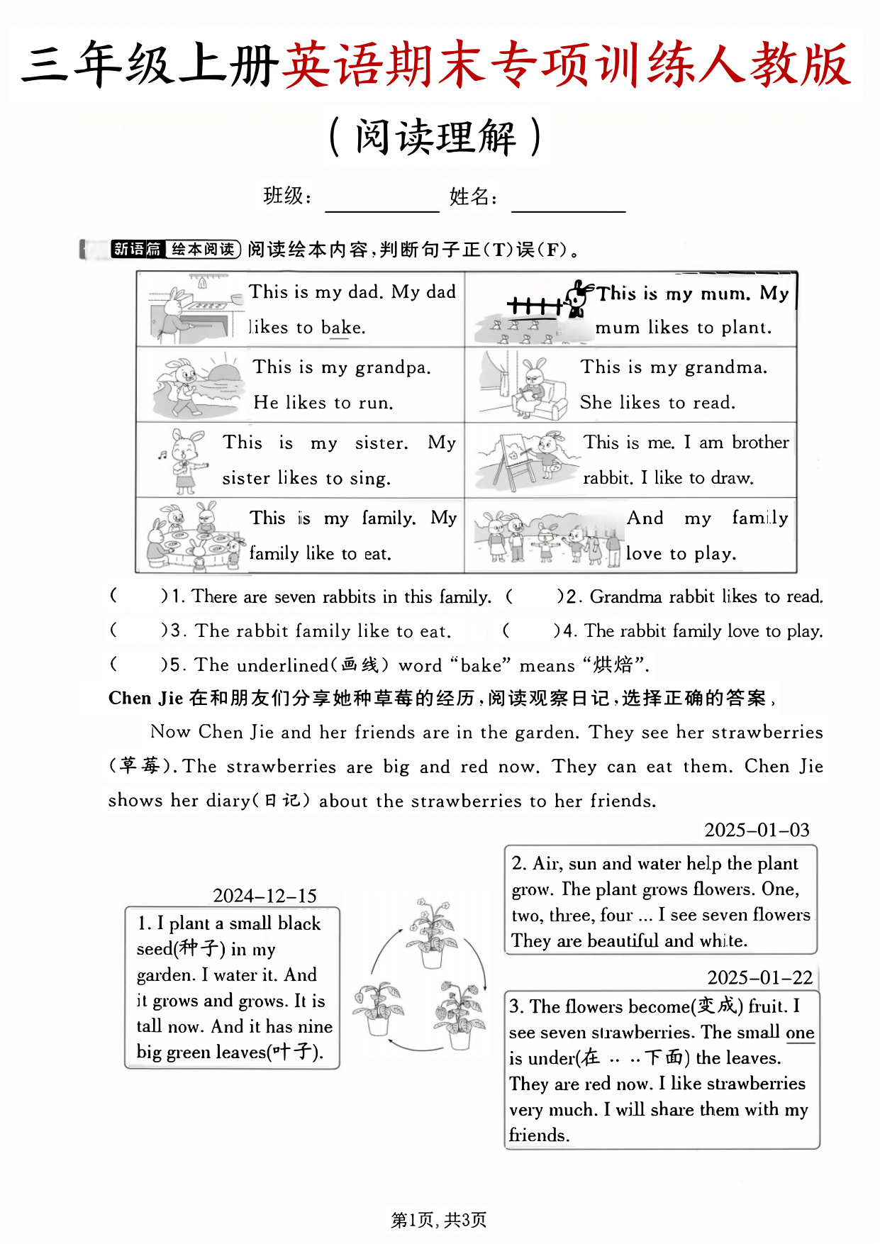 三年级(上)英语阅读理解、字母与词汇专项《人教版》