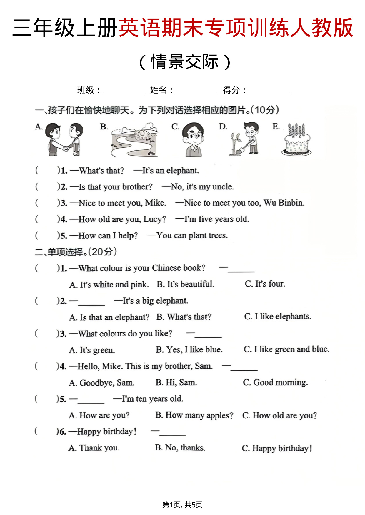 三年级(上)英语情景交际专项训练《人教版》(已优化)