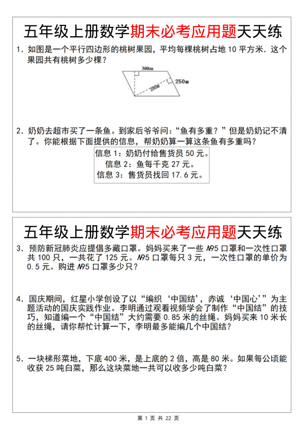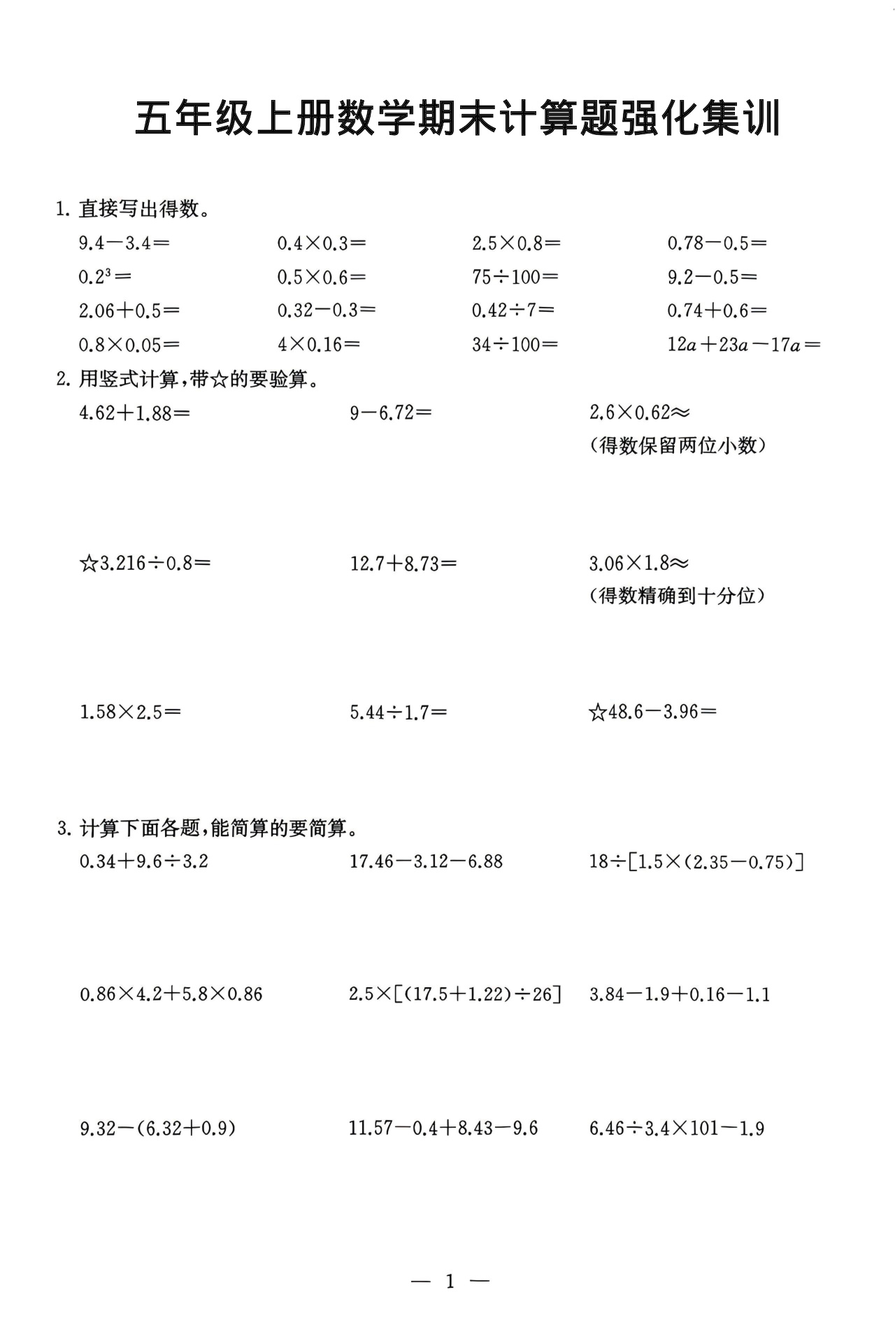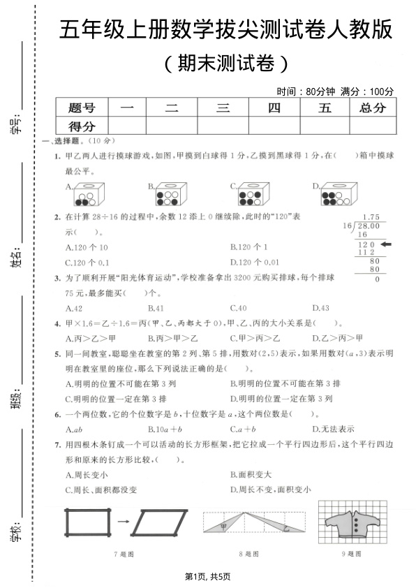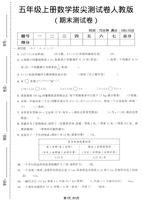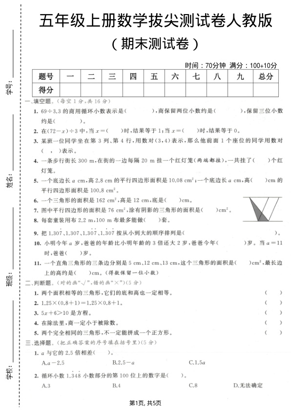 五年级(上)数学期末拔尖测试卷10《人教版》