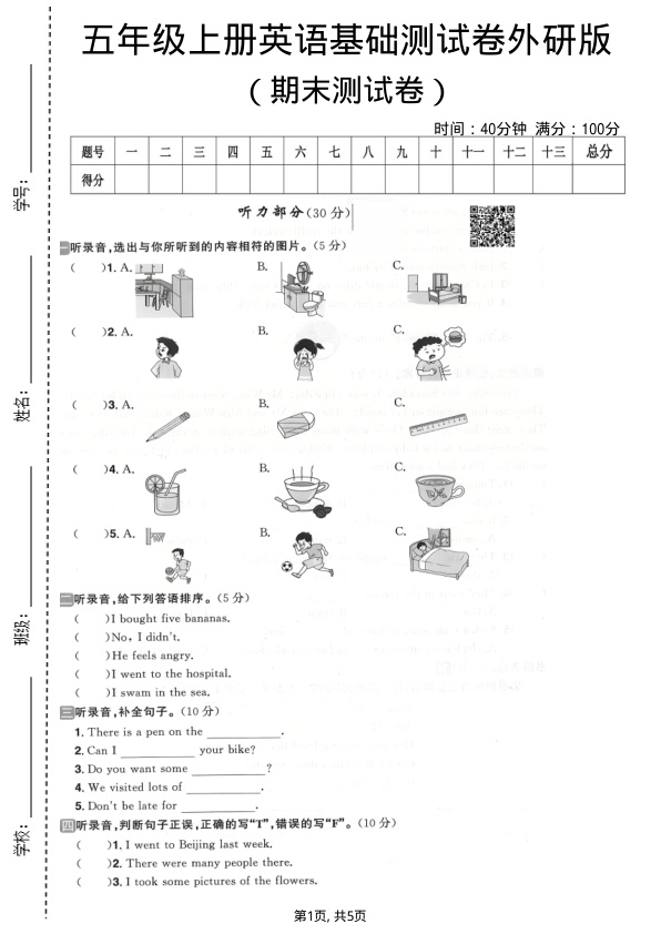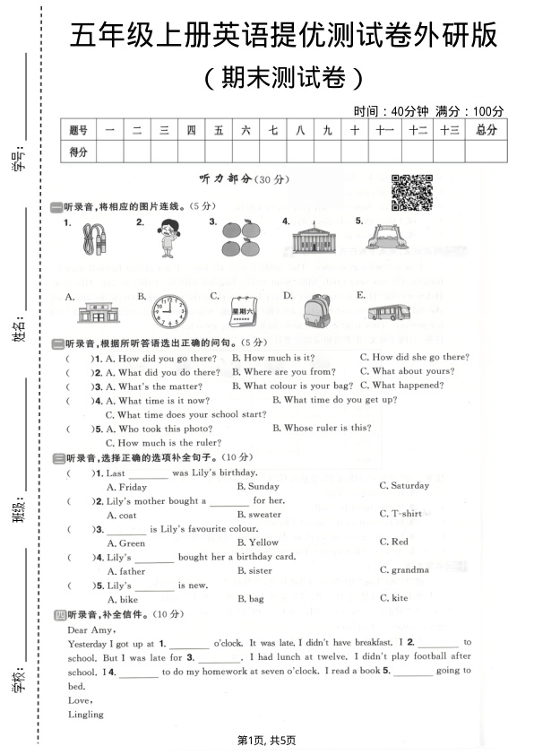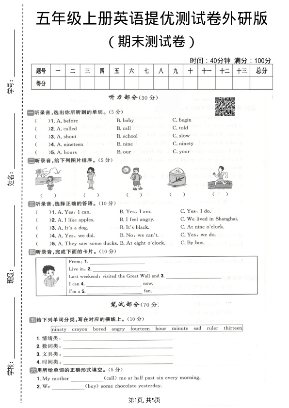 五年级(上)英语期末提优测试卷2《外研版》_1