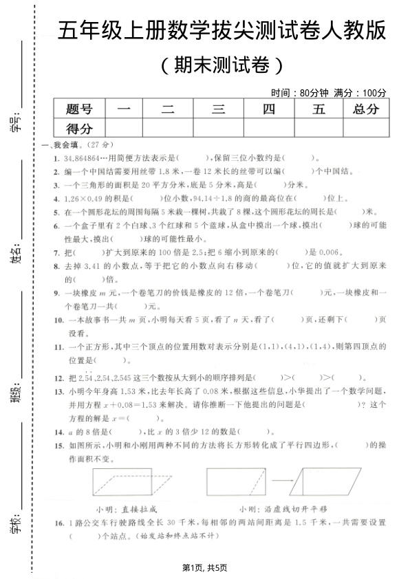 五年级(上)数学期末拔尖测试卷14《人教版》