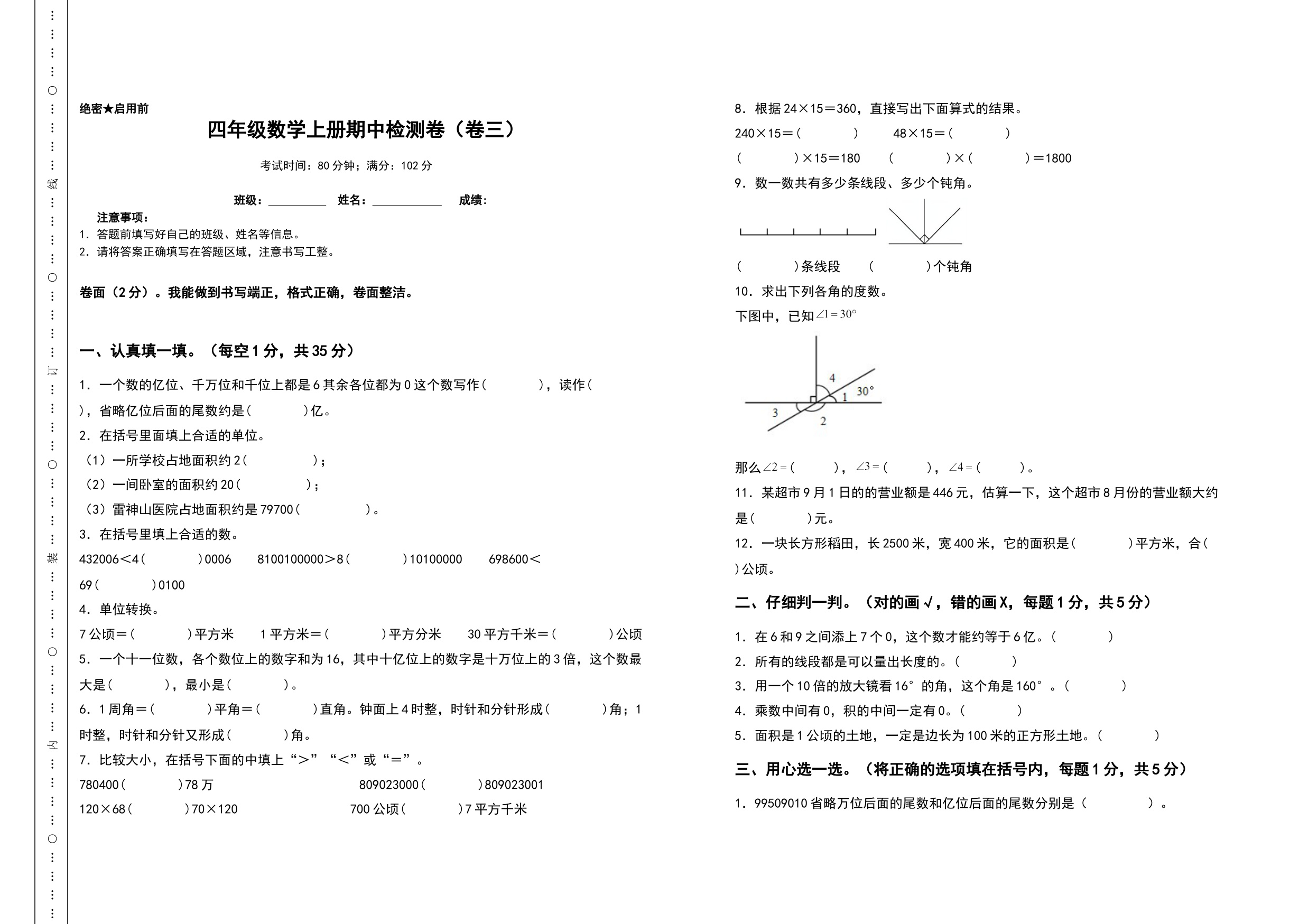 四年级数学上册期中检测卷(卷二)(含答案)人教版