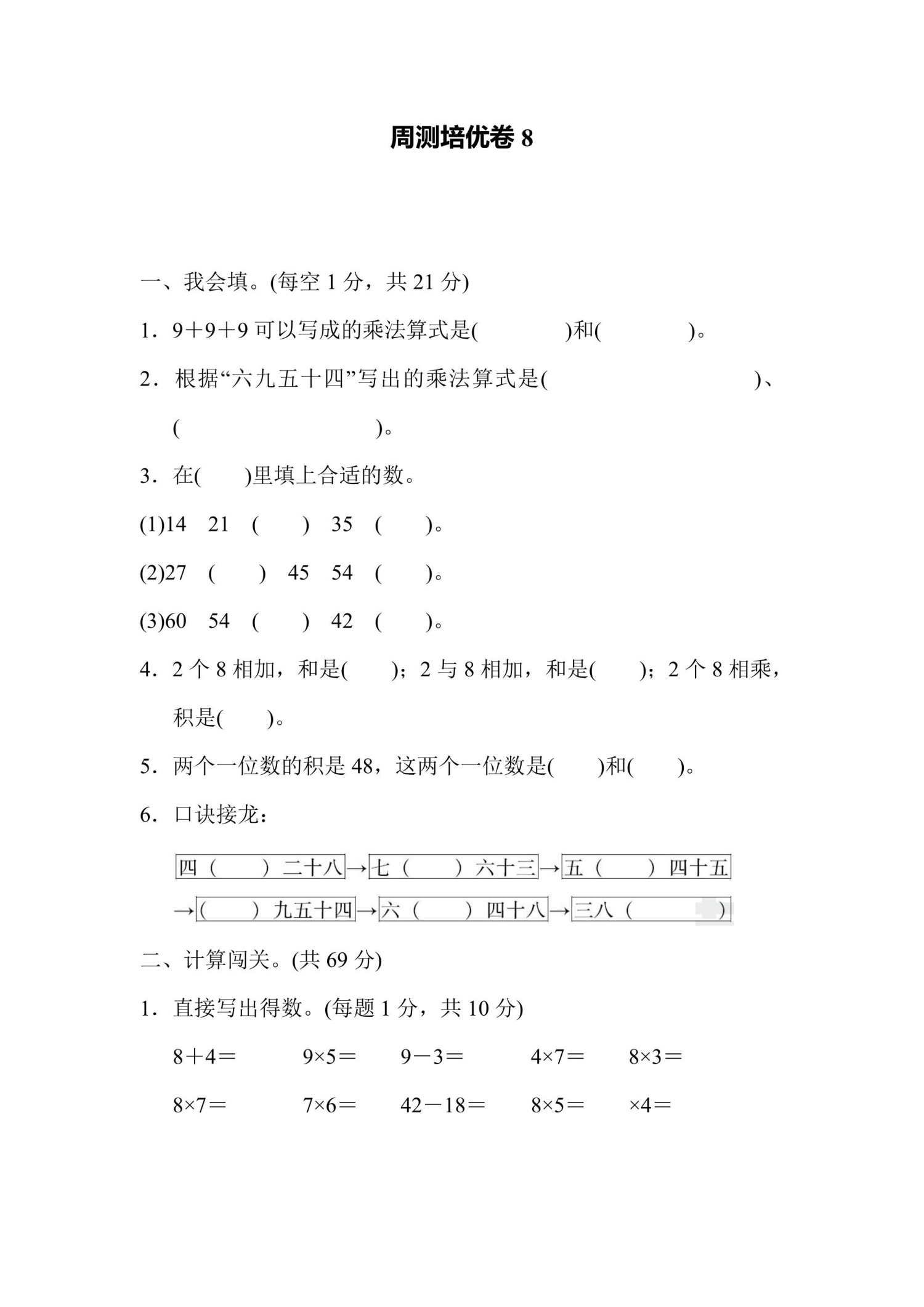 二年级上册数学人教版周测培优卷8 表内乘法7~9的计算能力检测卷(含答案)