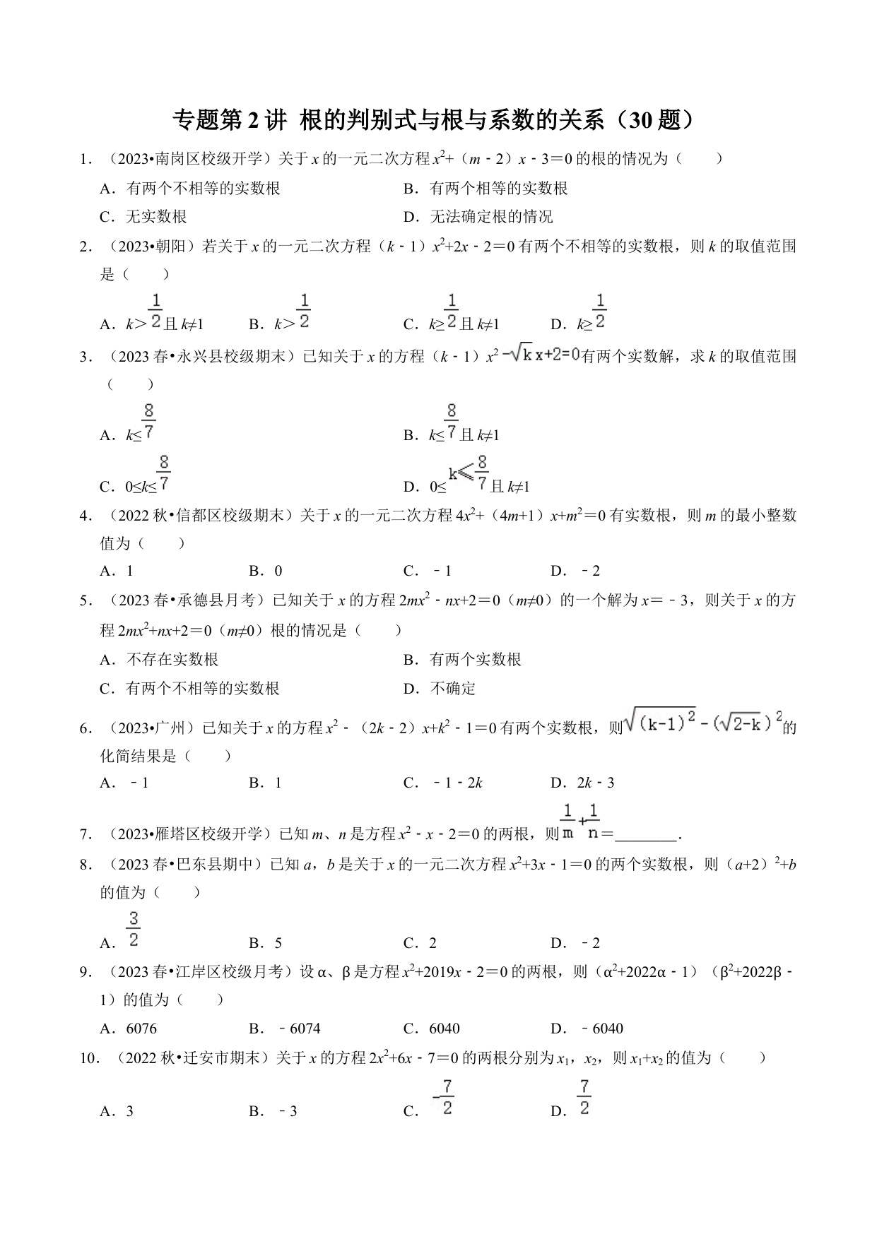 【人教版】九下数学专题02 根的判别式与根与系数的关系-同步练习(原卷版)