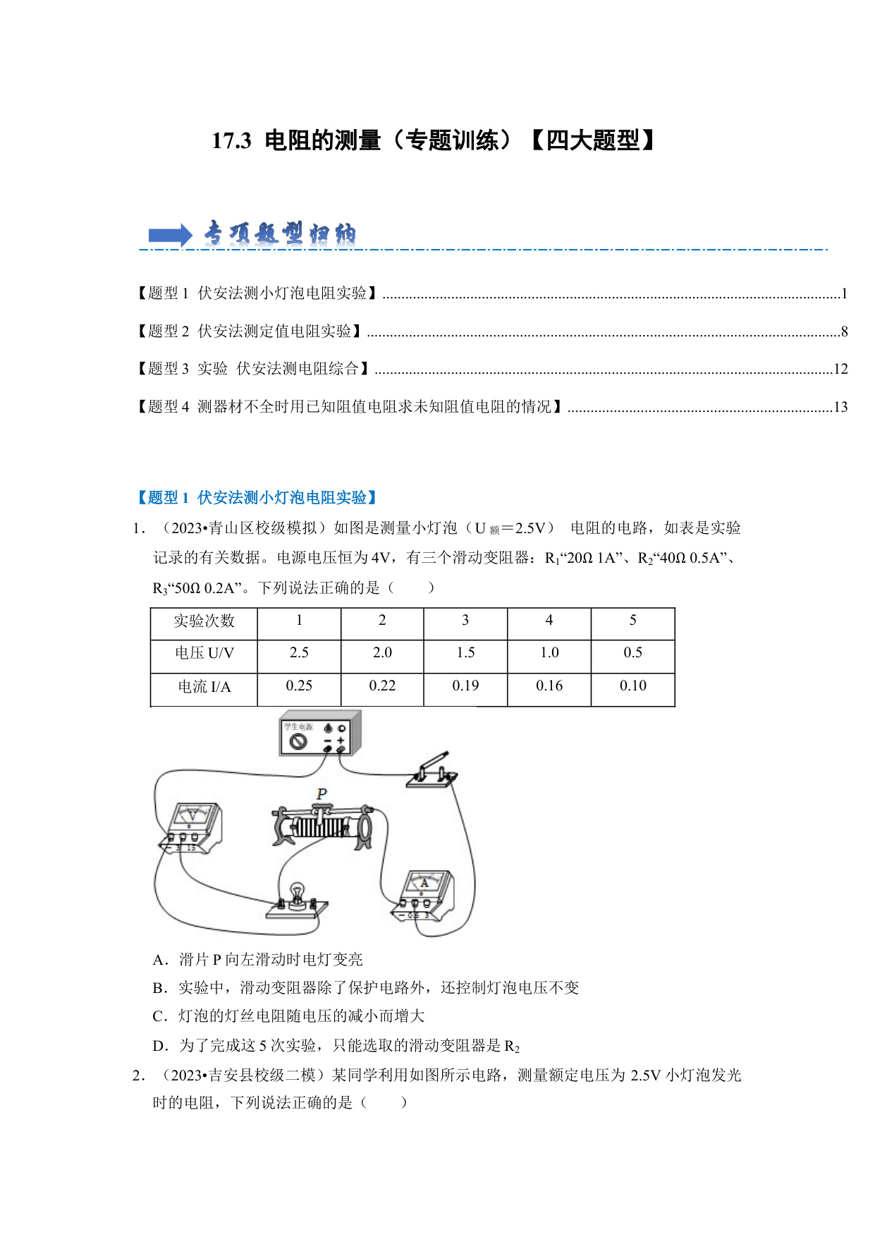 【人教版】九全物理同步练习 17.3 电阻的测量(专题训练)【四大题型】(原卷版)