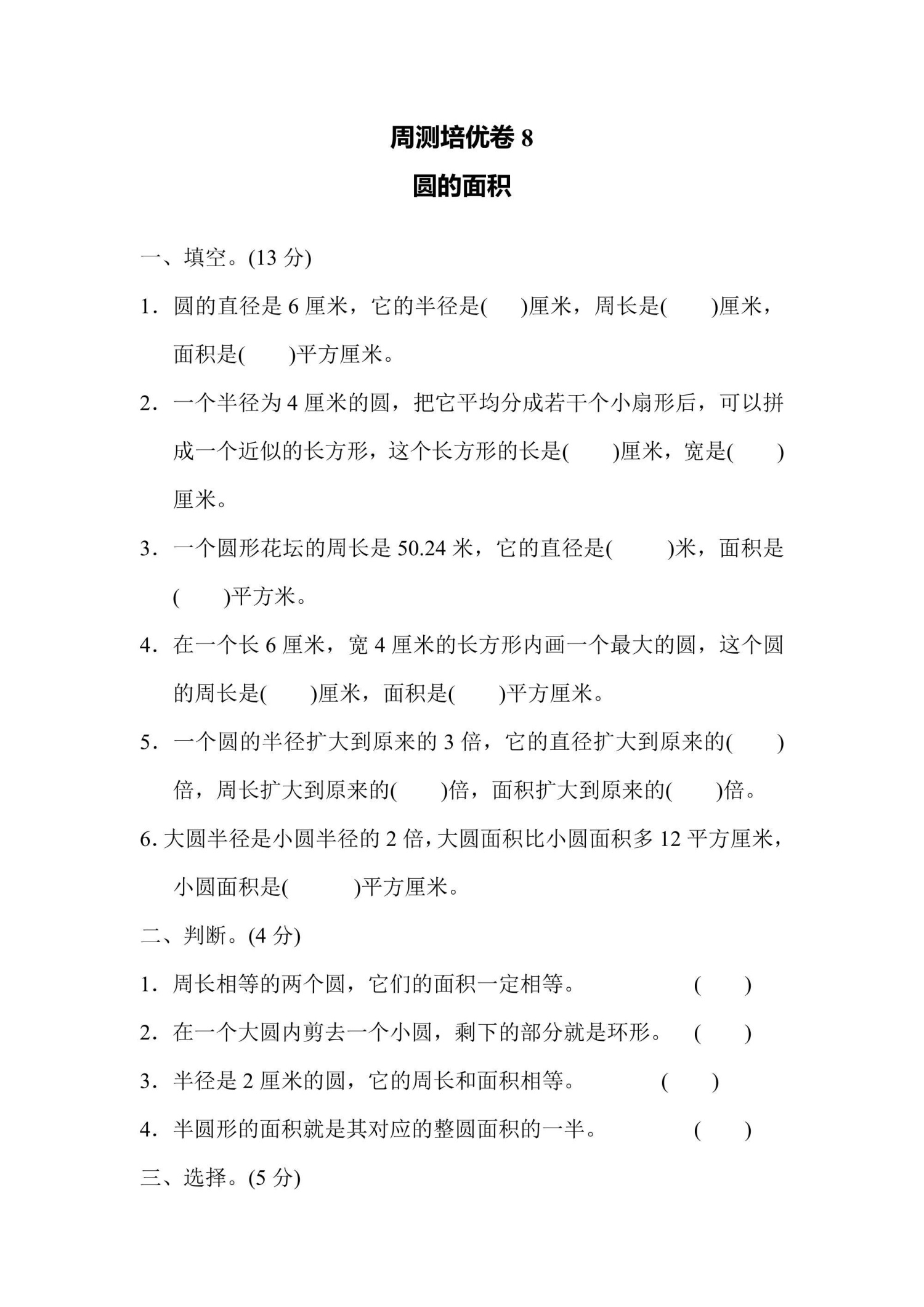 六年级上册数学青岛版周测培优卷8圆的面积(含答案)