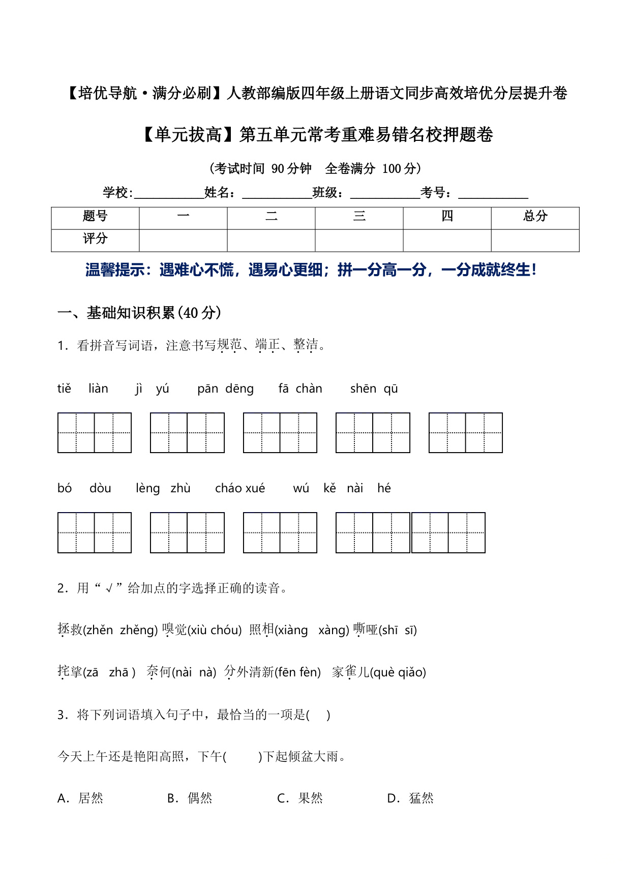 【单元拔高】第五单元常考重难易错名校押题卷 部编版(含答案)