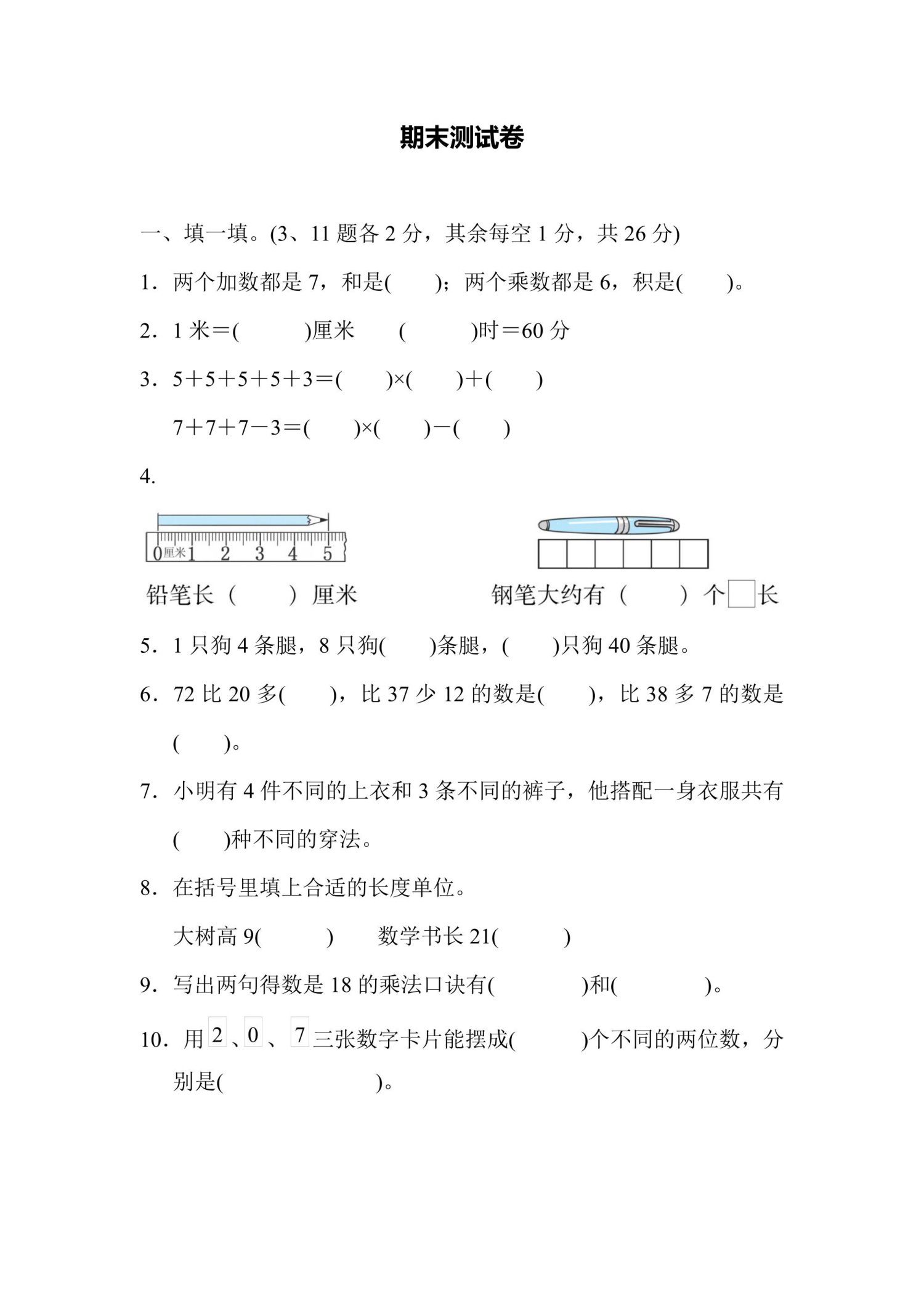 二年级上册数学人教版期末测试卷(含答案)