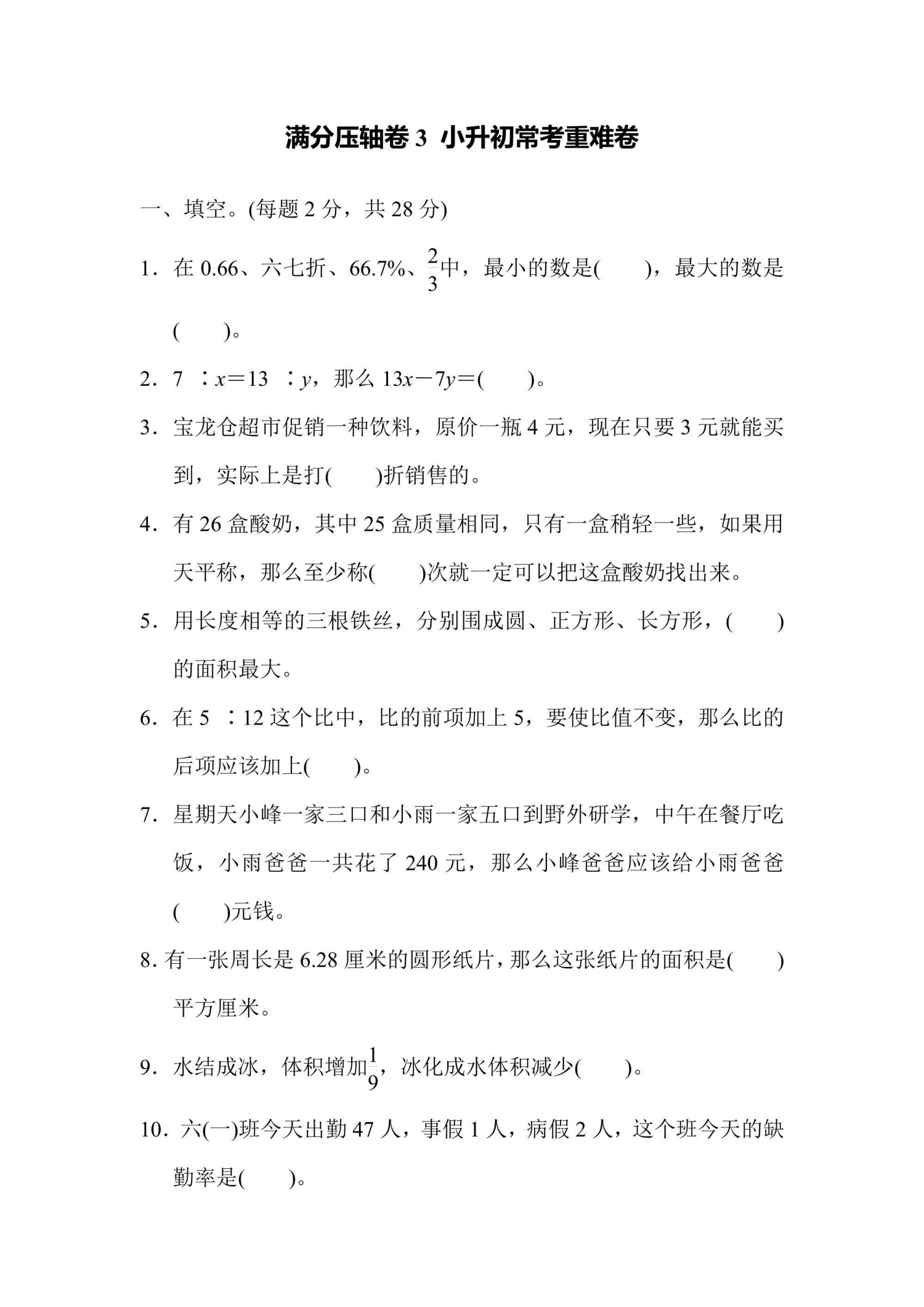 六年级上册数学冀教版满分压轴卷3小升初常考重难卷(含答案)