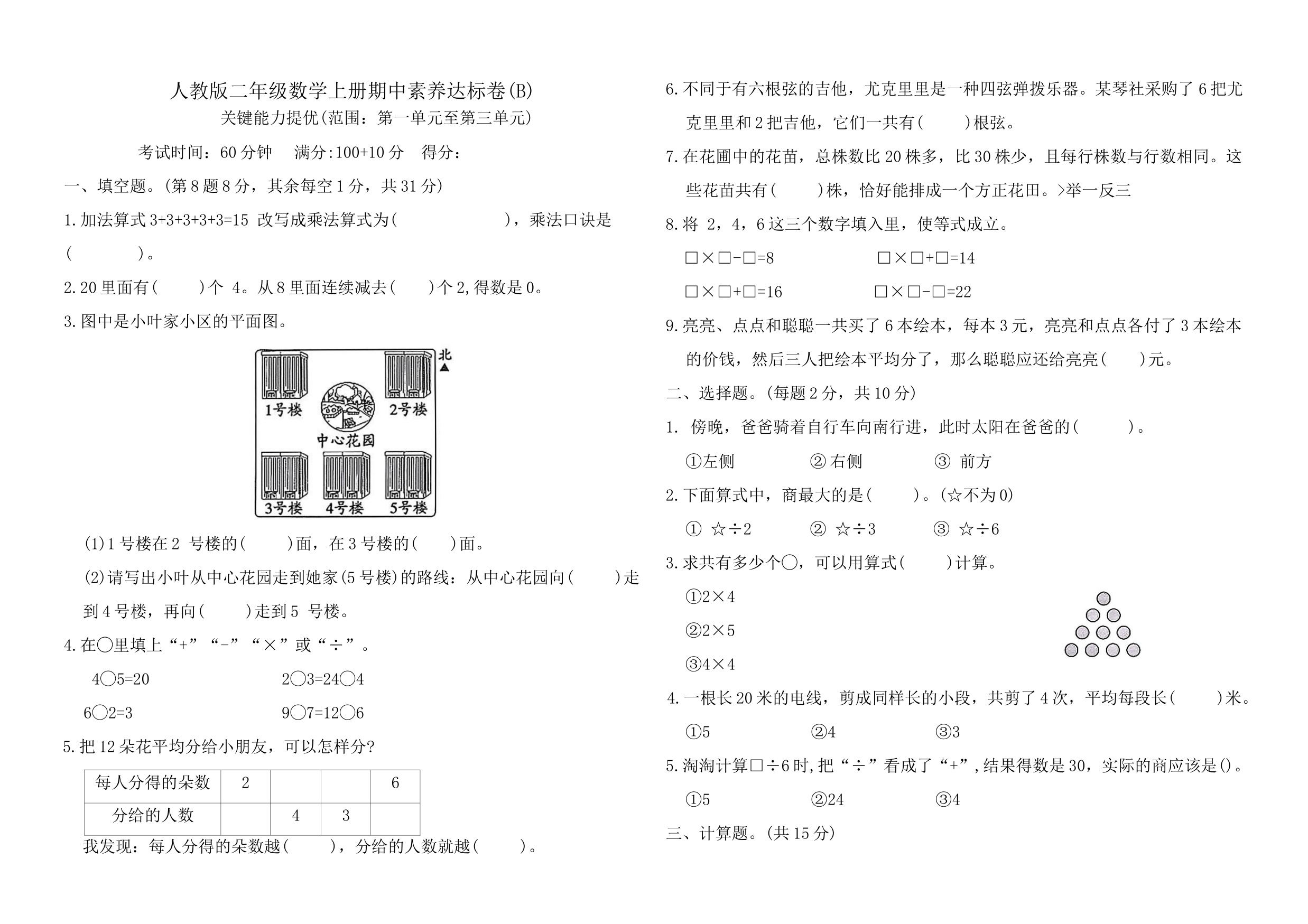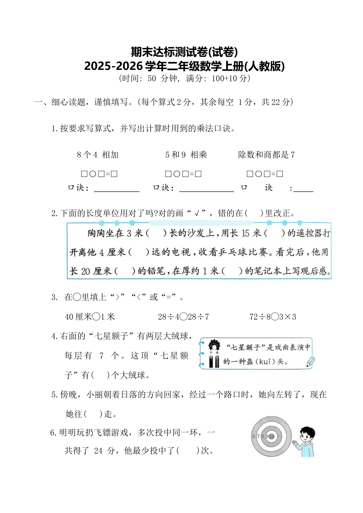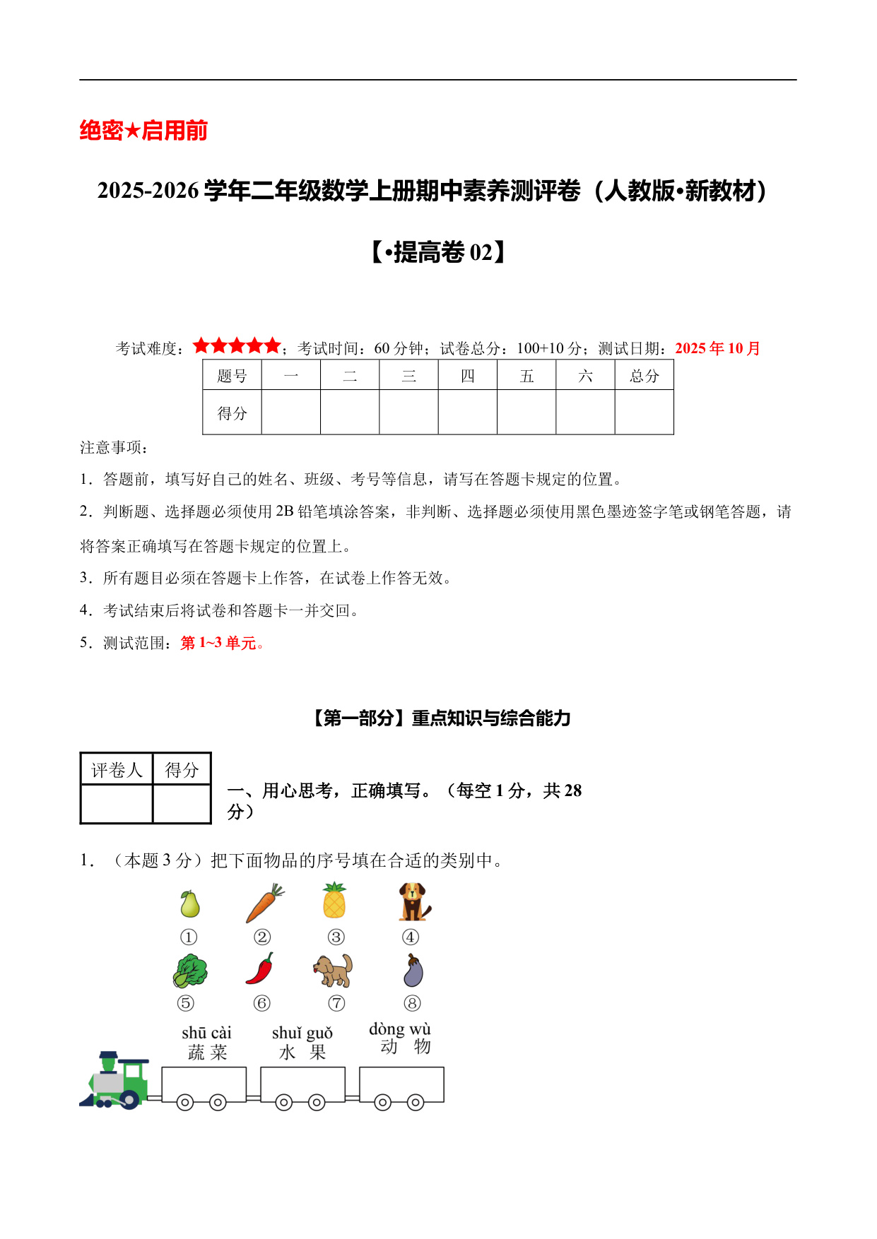 【A4考试版】数学(提高卷02)-2025-2026学年二年级数学上册期中素养测评卷(人教版·新教材)