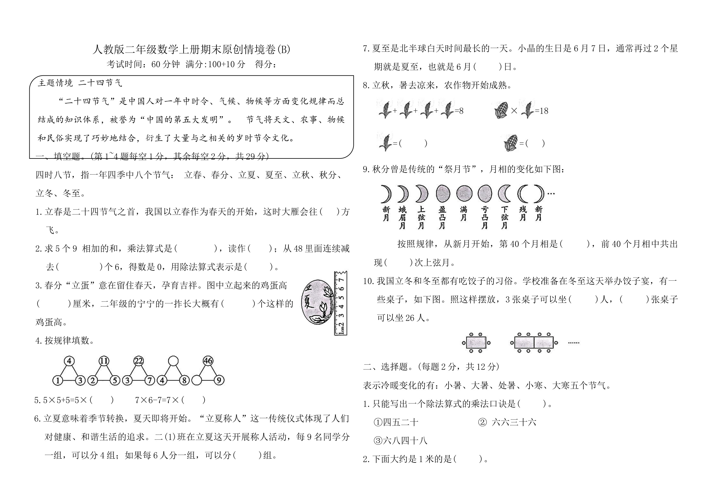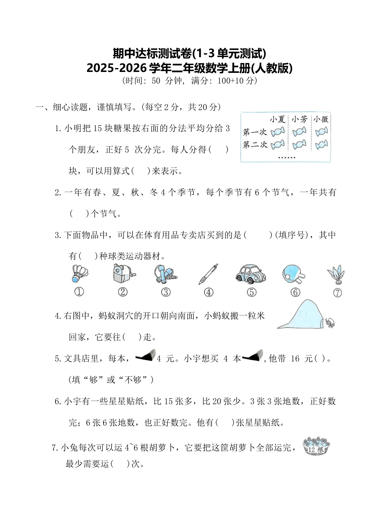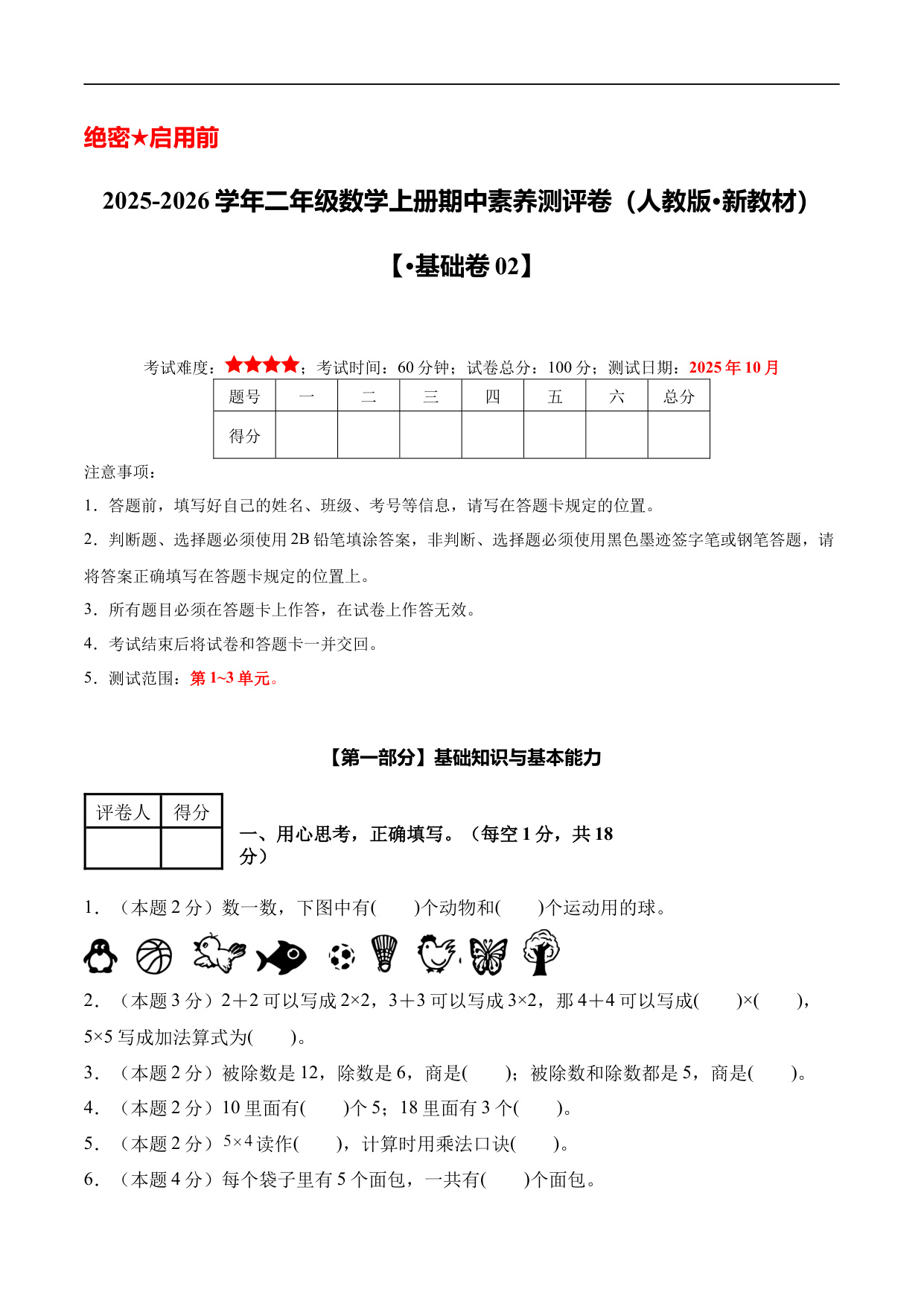 【A4考试版】数学(基础卷02)-2025-2026学年二年级数学上册期中素养测评卷(人教版·新教材)