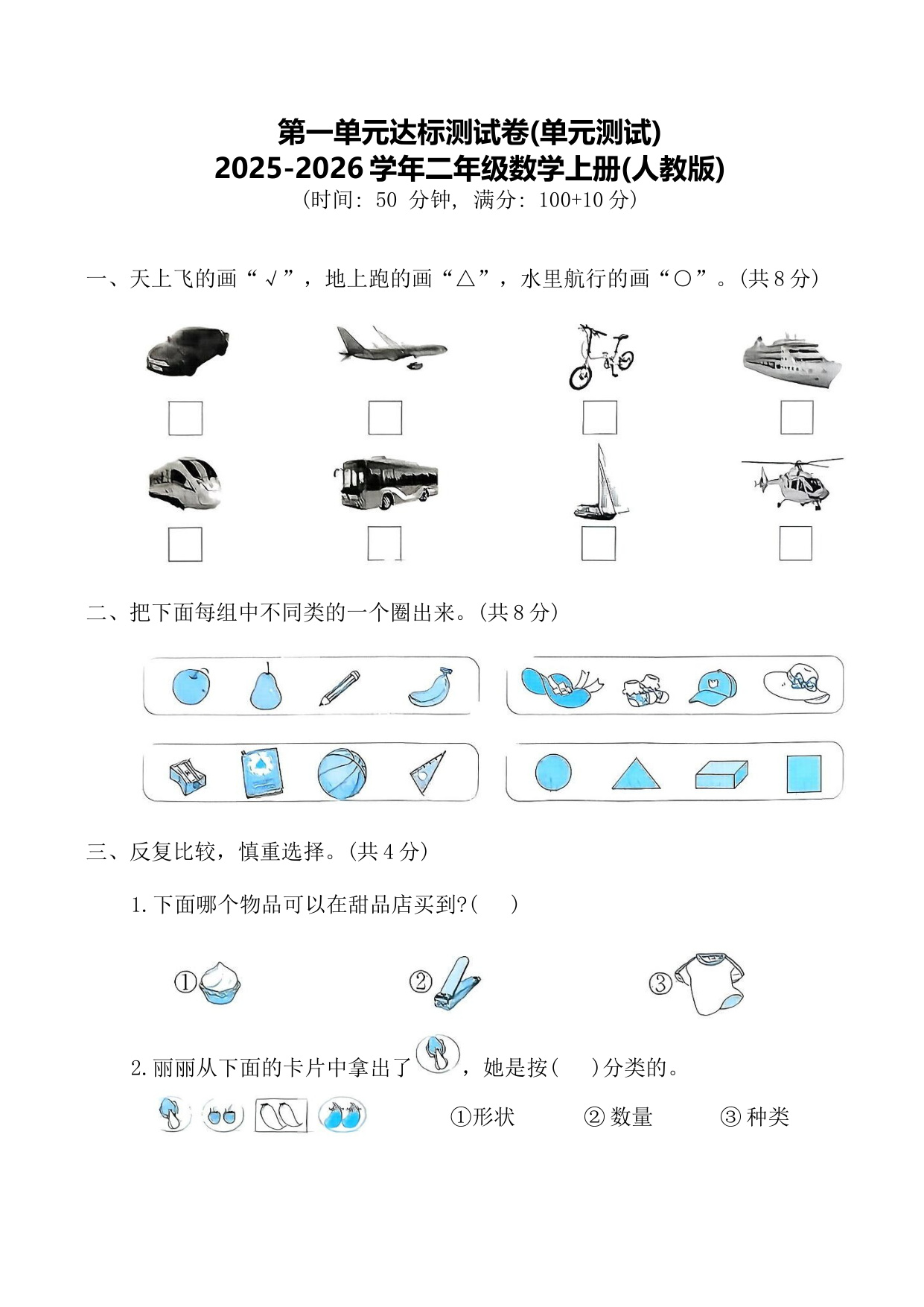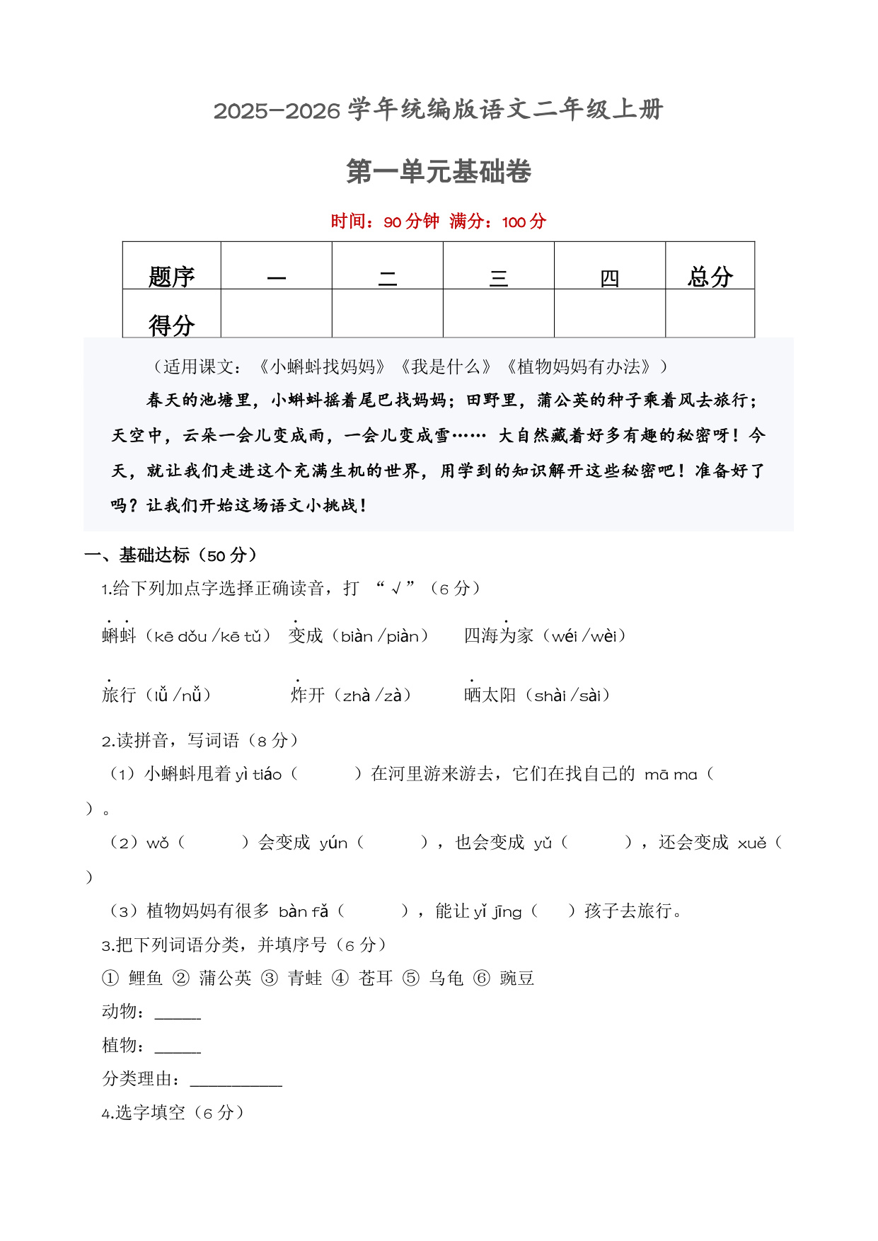 第二单元 认识事物,归类识字(单元测试·基础卷)