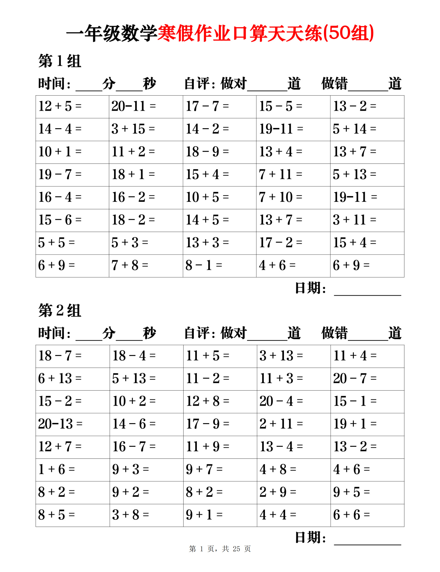 一年级(上)数学寒假作业口算天天练(50组)25页