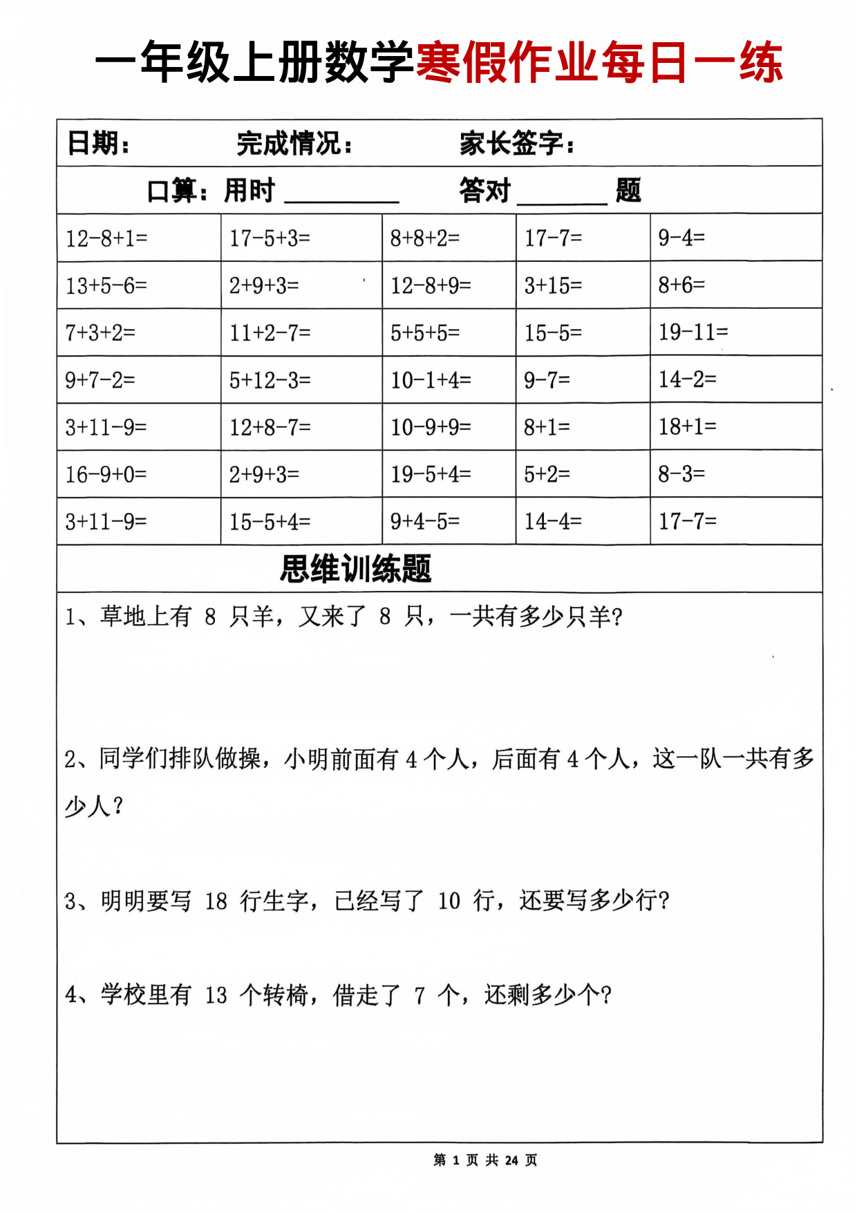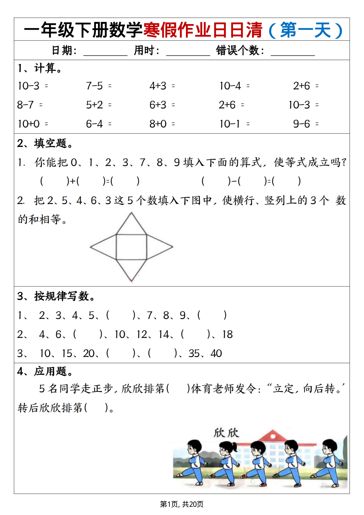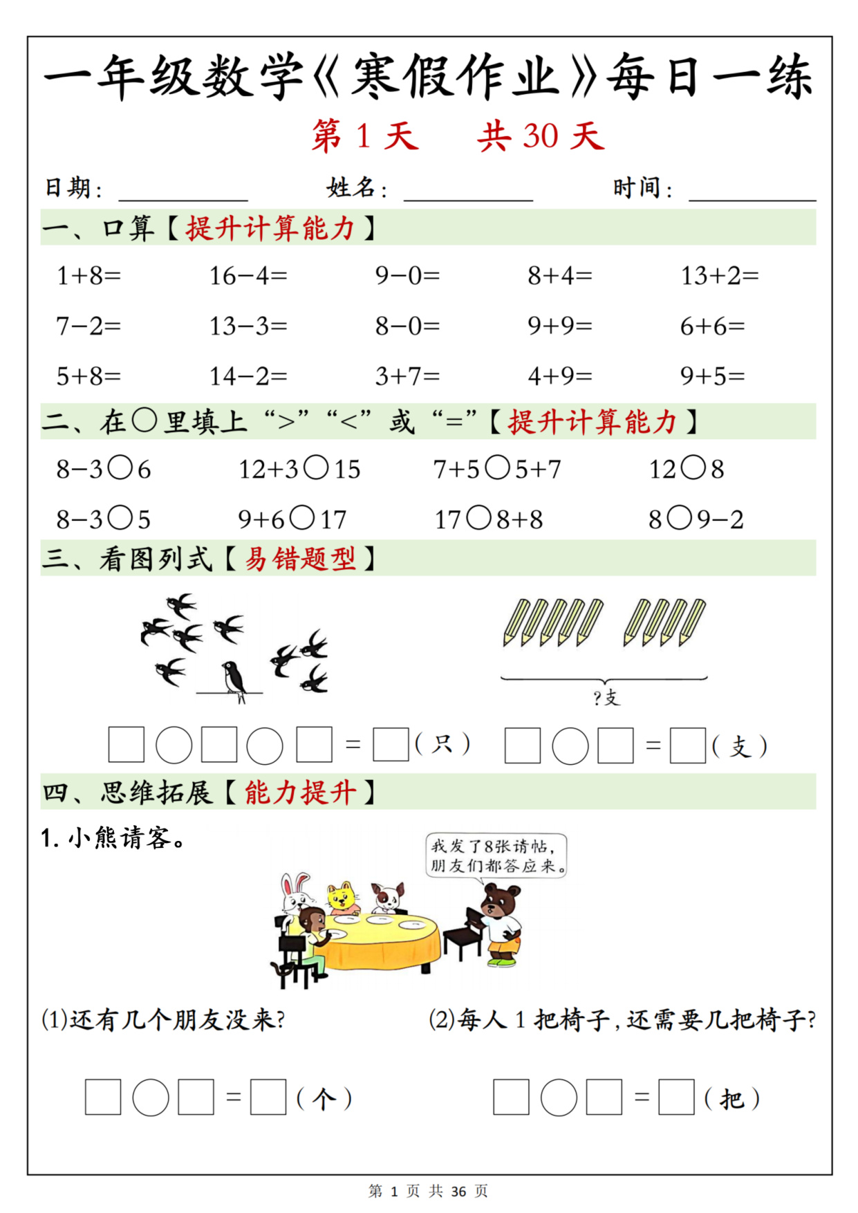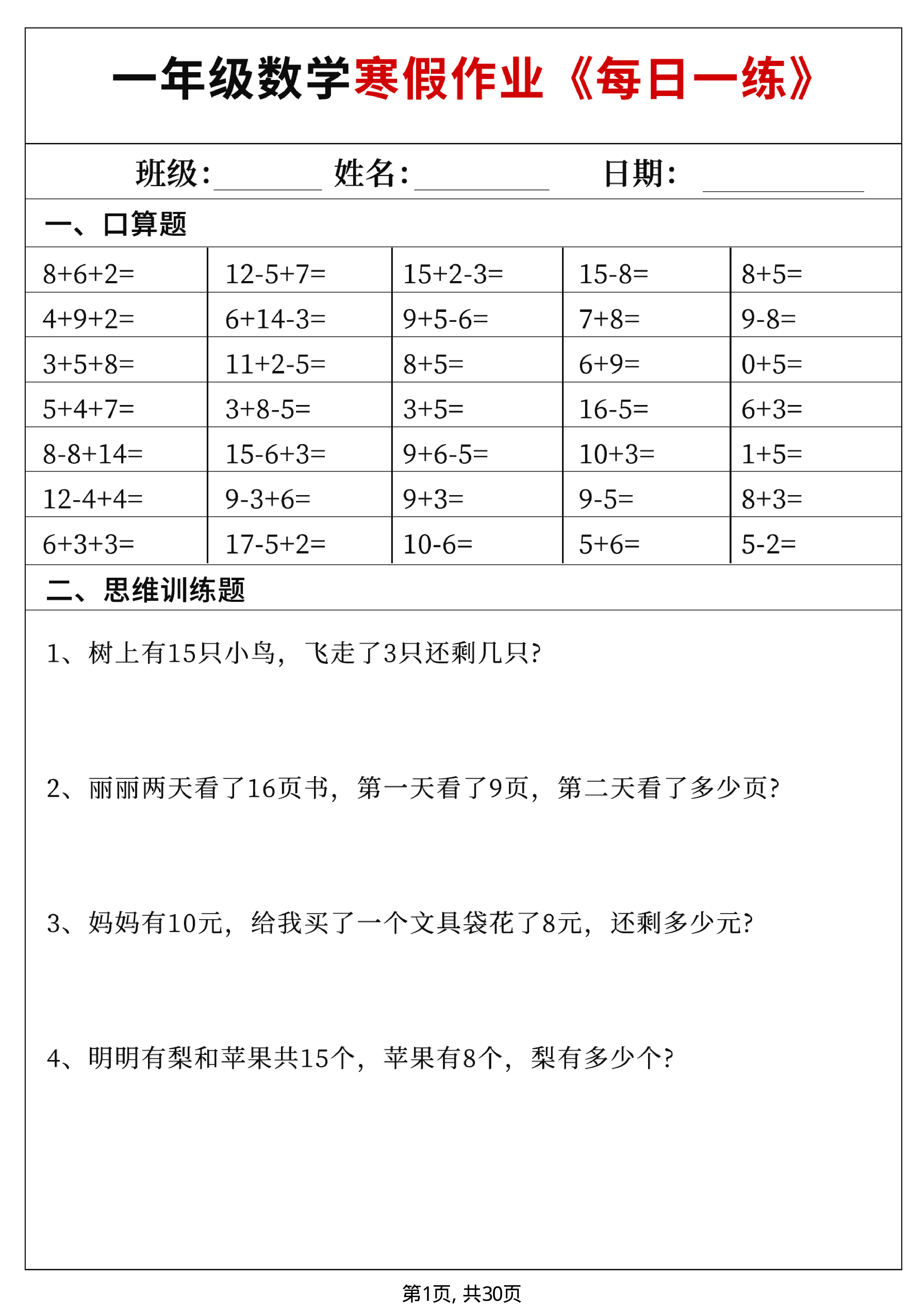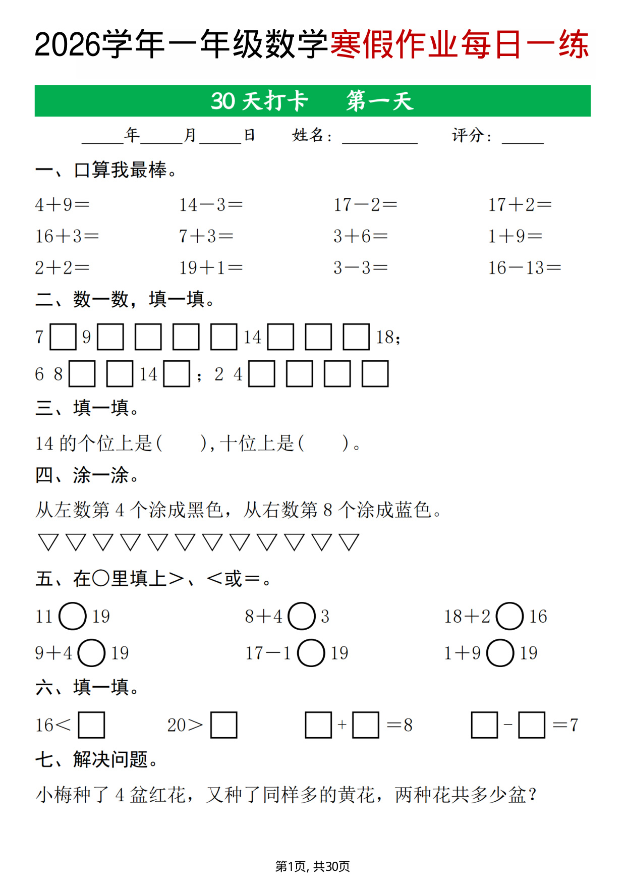 一年级(上)数学寒假作业每日一练30天打卡专项练习