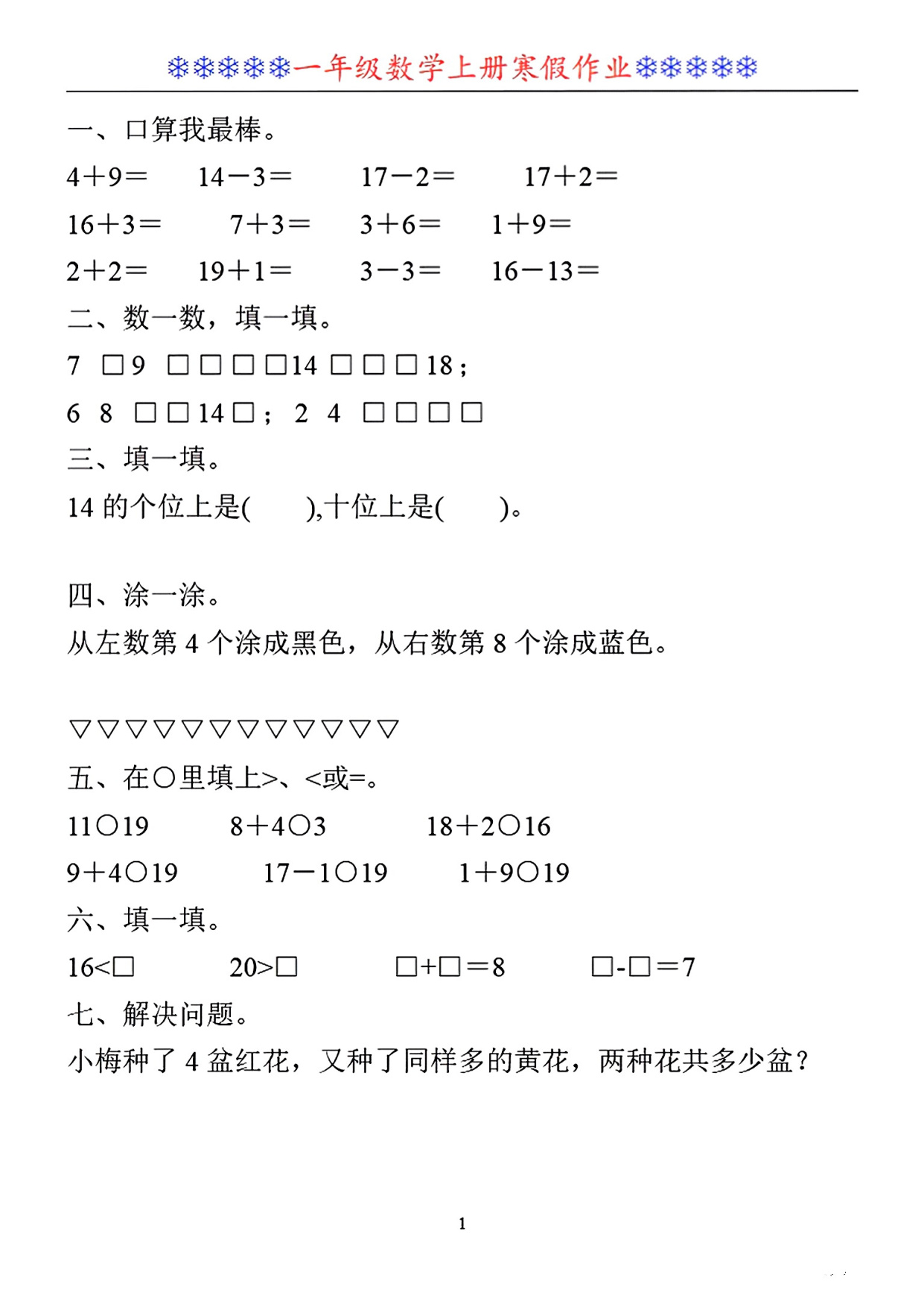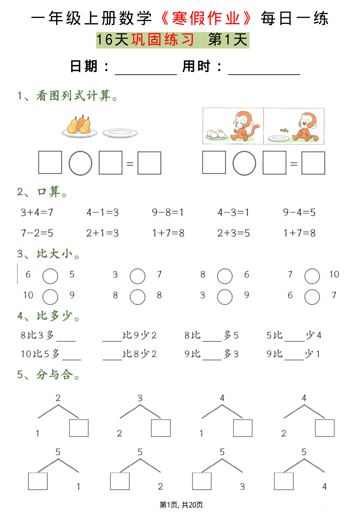 一年级(上)数学寒假作业每日一练(16天巩固练习)