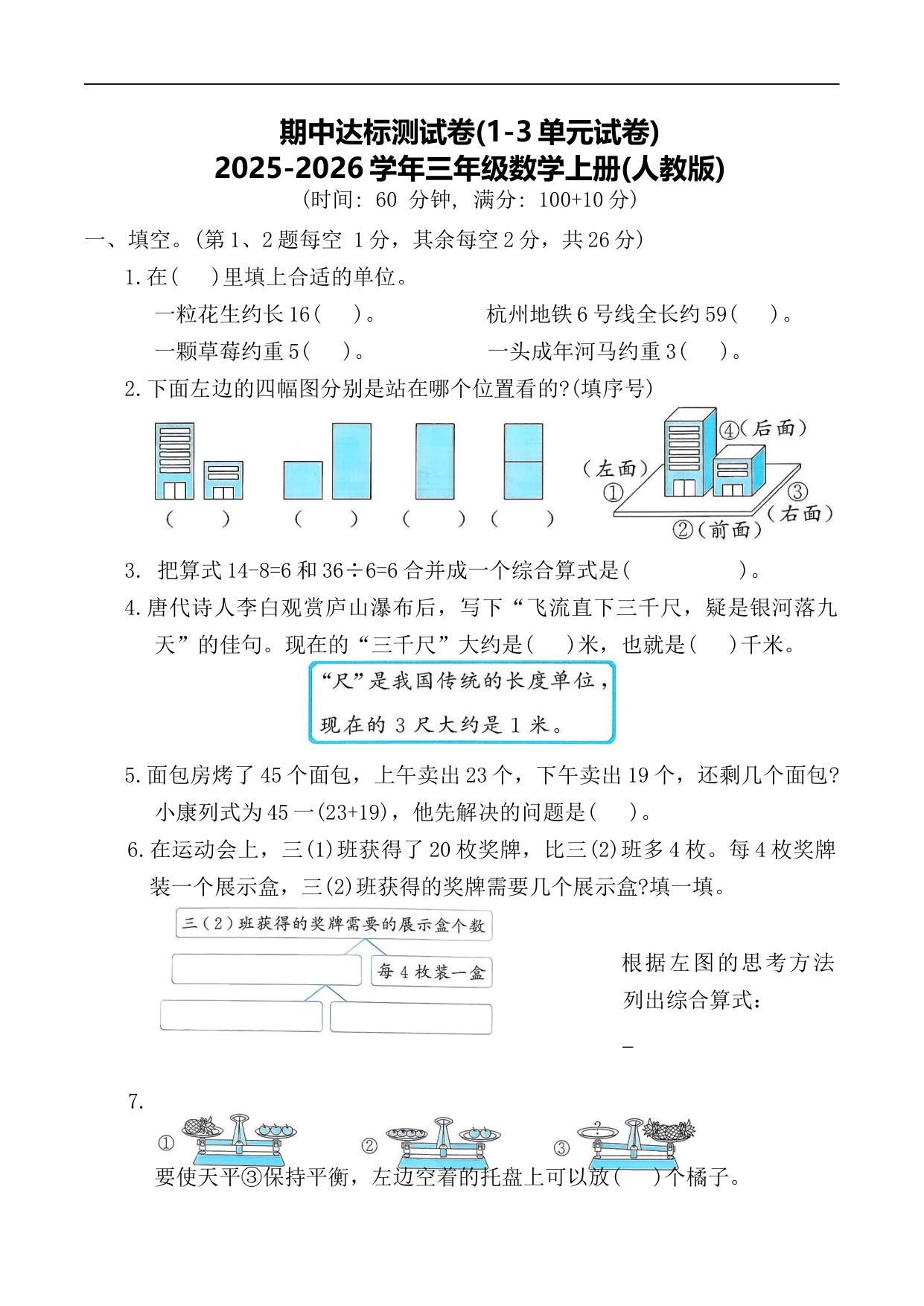 期末学业质量评价卷三(试卷)2025-2026学年三年级数学上册(人教版)