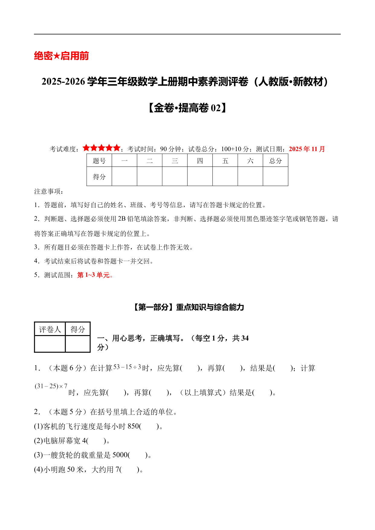 【A4考试版】数学(提高卷02)-2025-2026学年三年级数学上册期中素养测评卷(人教版·新教材)