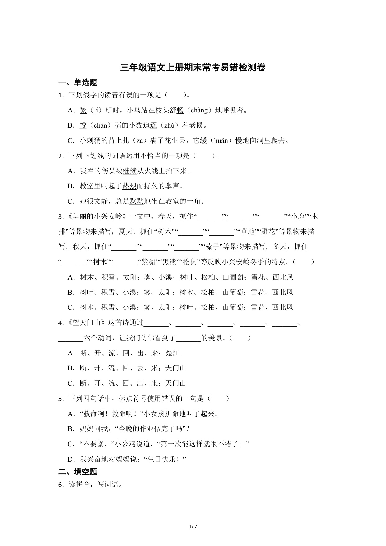 期末考前必刷:三年级语文上册期末常考易错检测卷