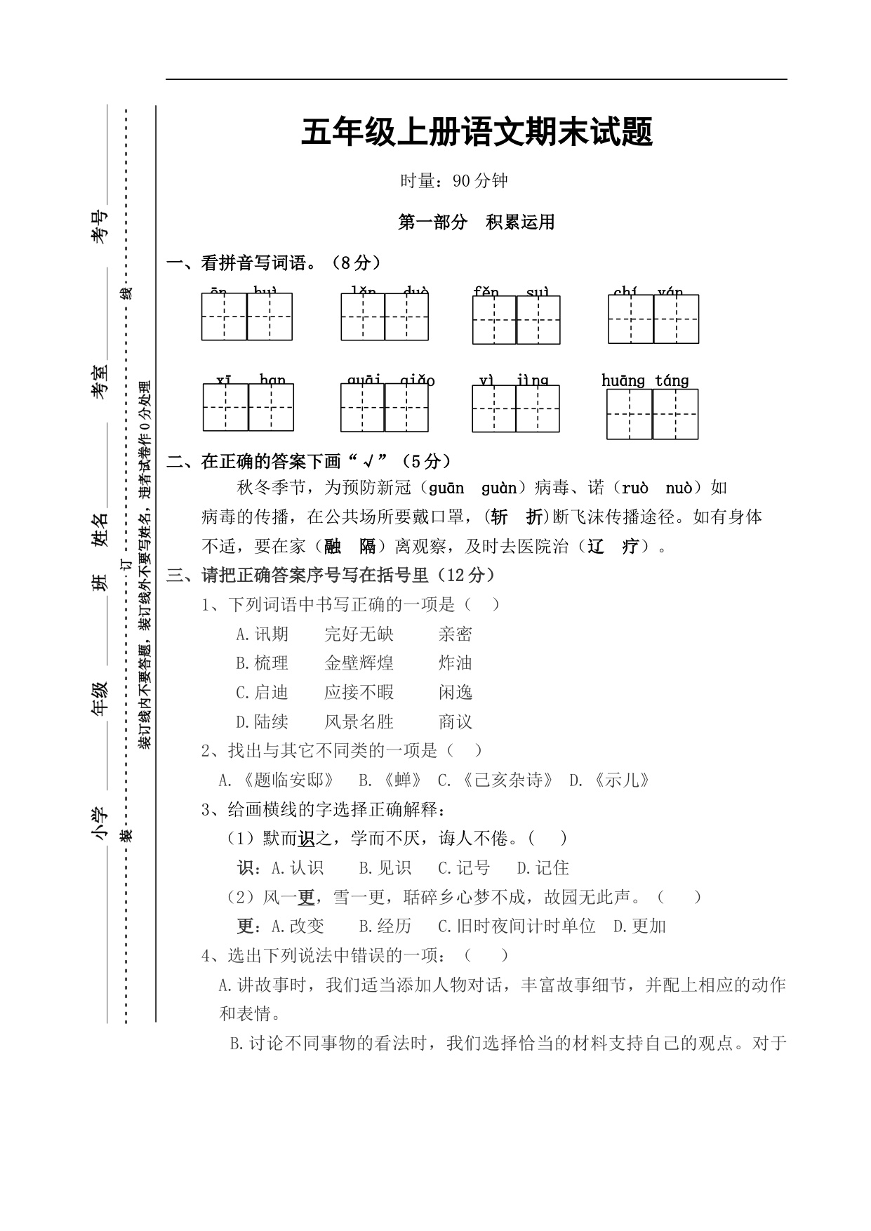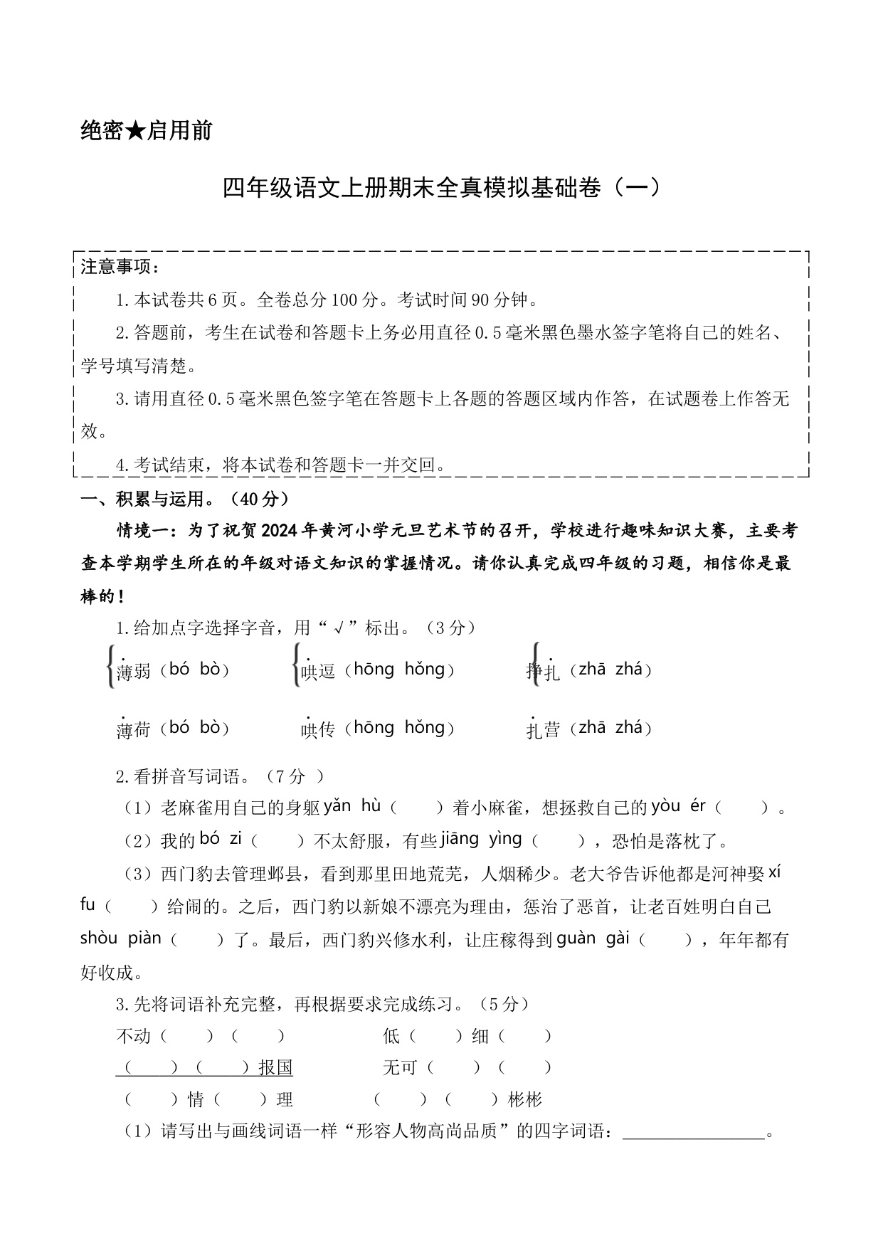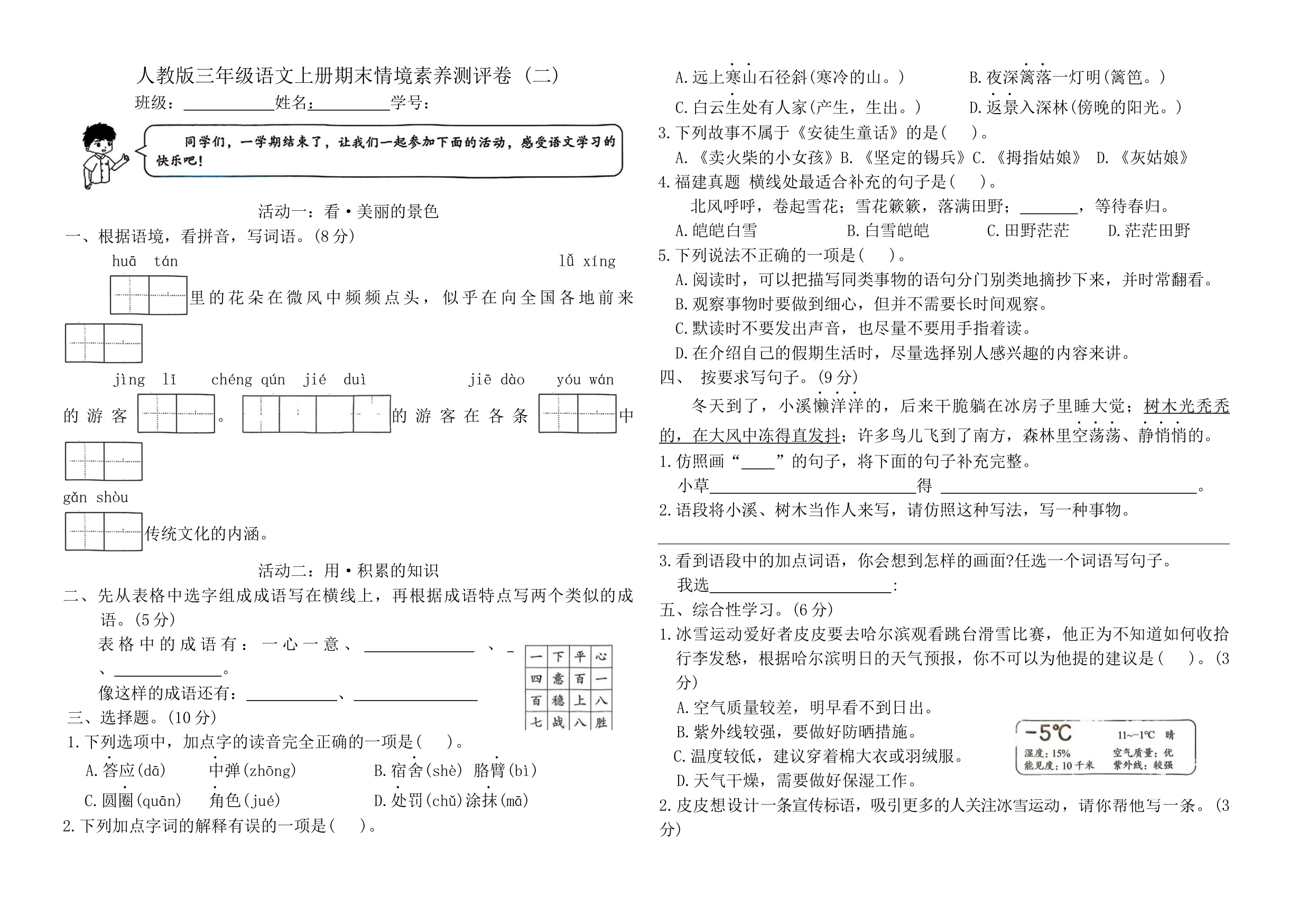 三年级语文上学期期末全真模拟·情境基础卷01