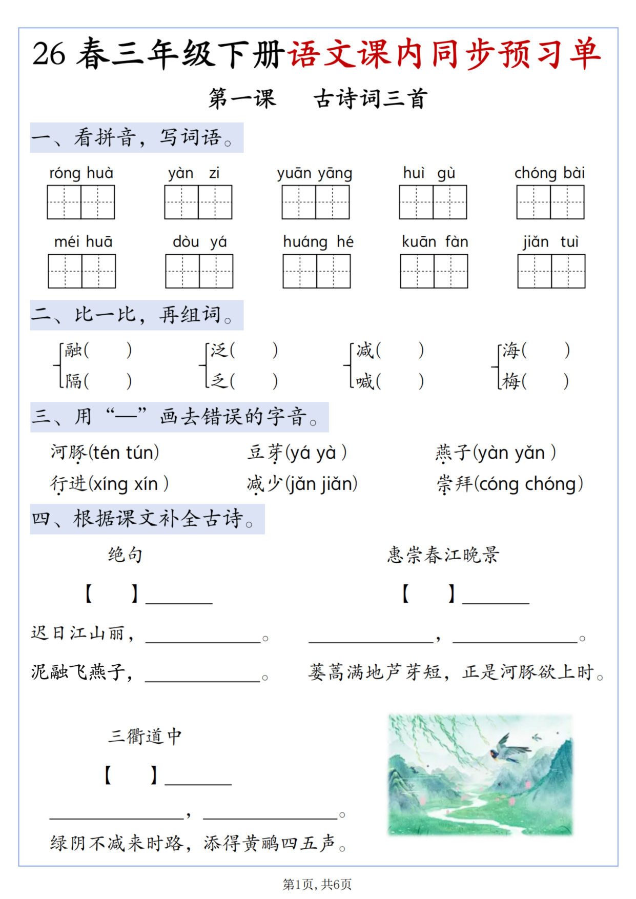 三年级(下)语文第一单元课内同步预习单 人教版