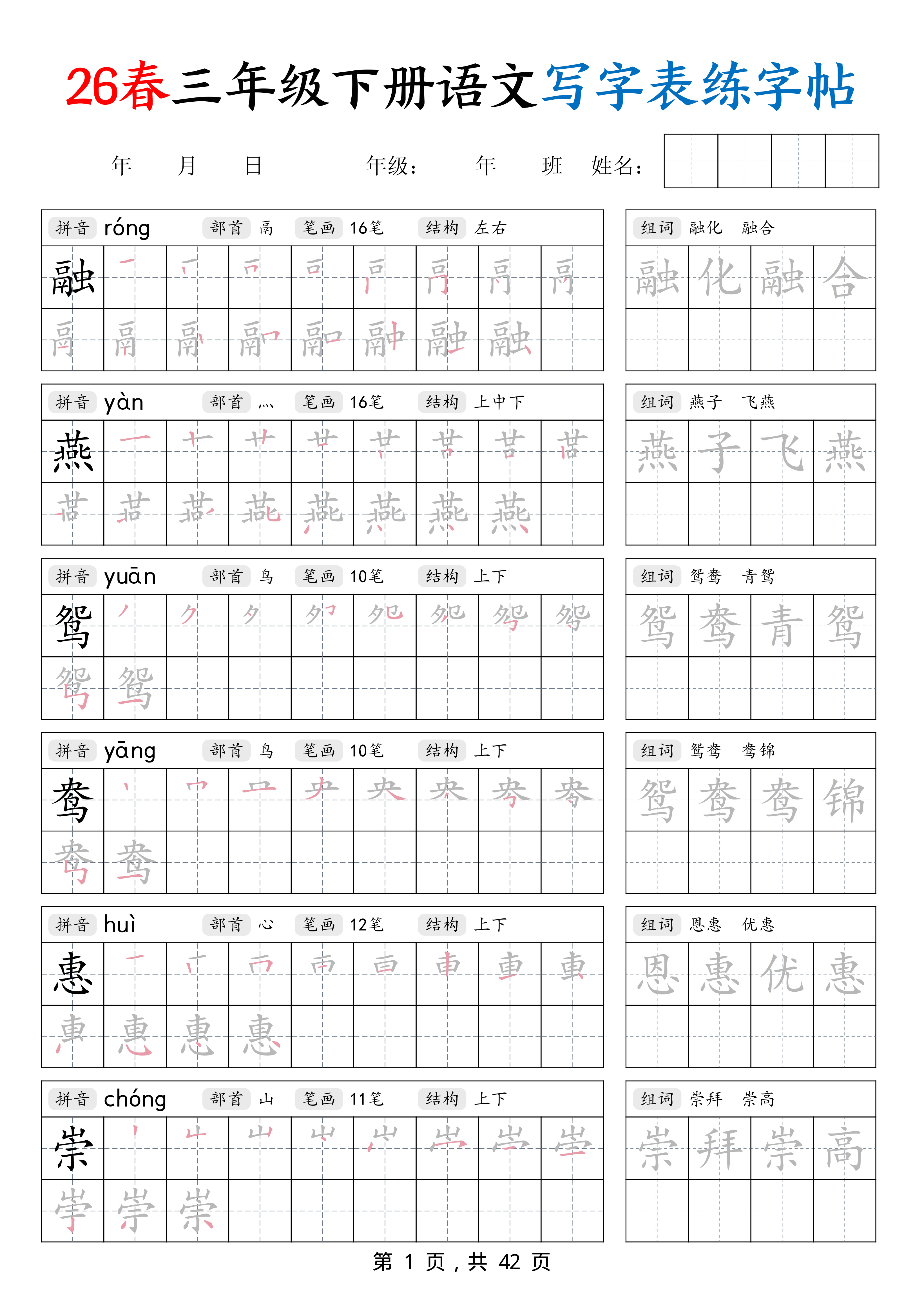 三年级(下)语文写字表练字帖