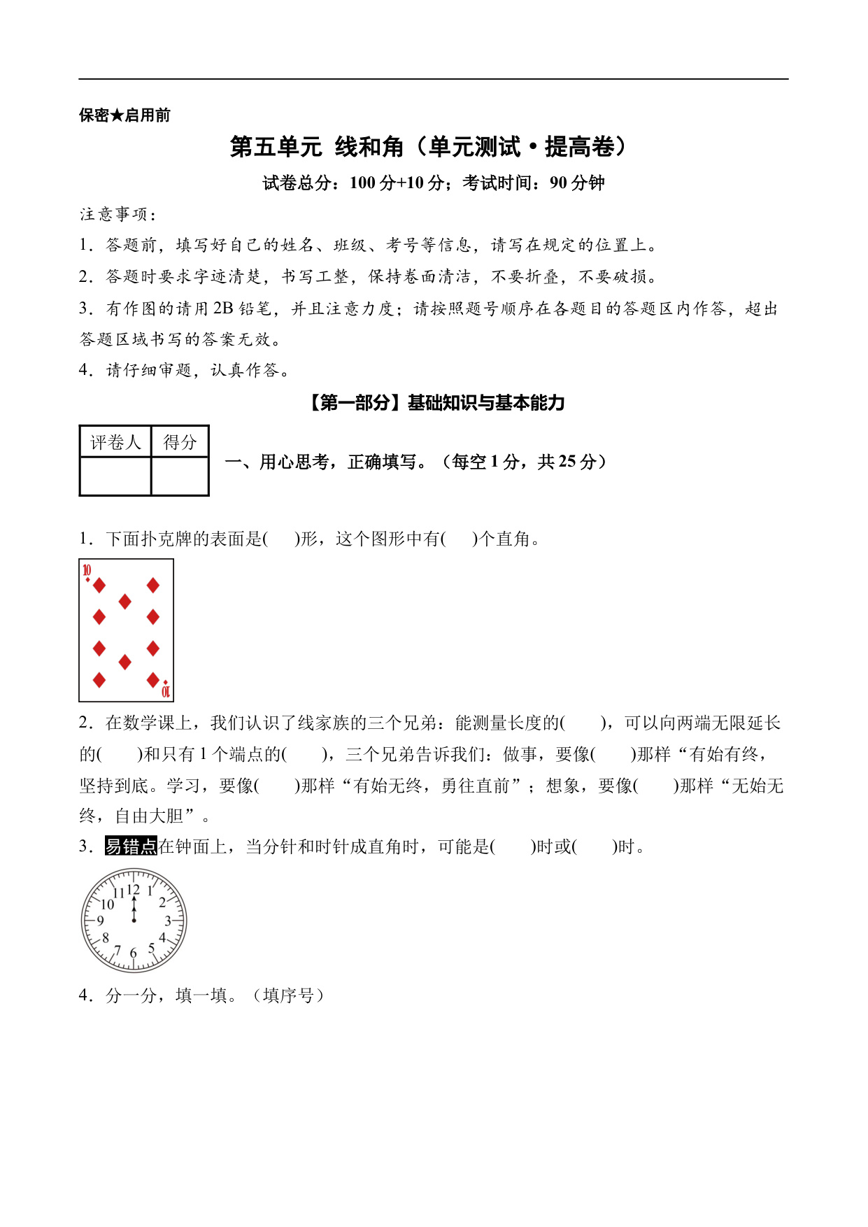 第五单元 线和角(单元测试 提高卷)数学人教版三年级上册(A4版)