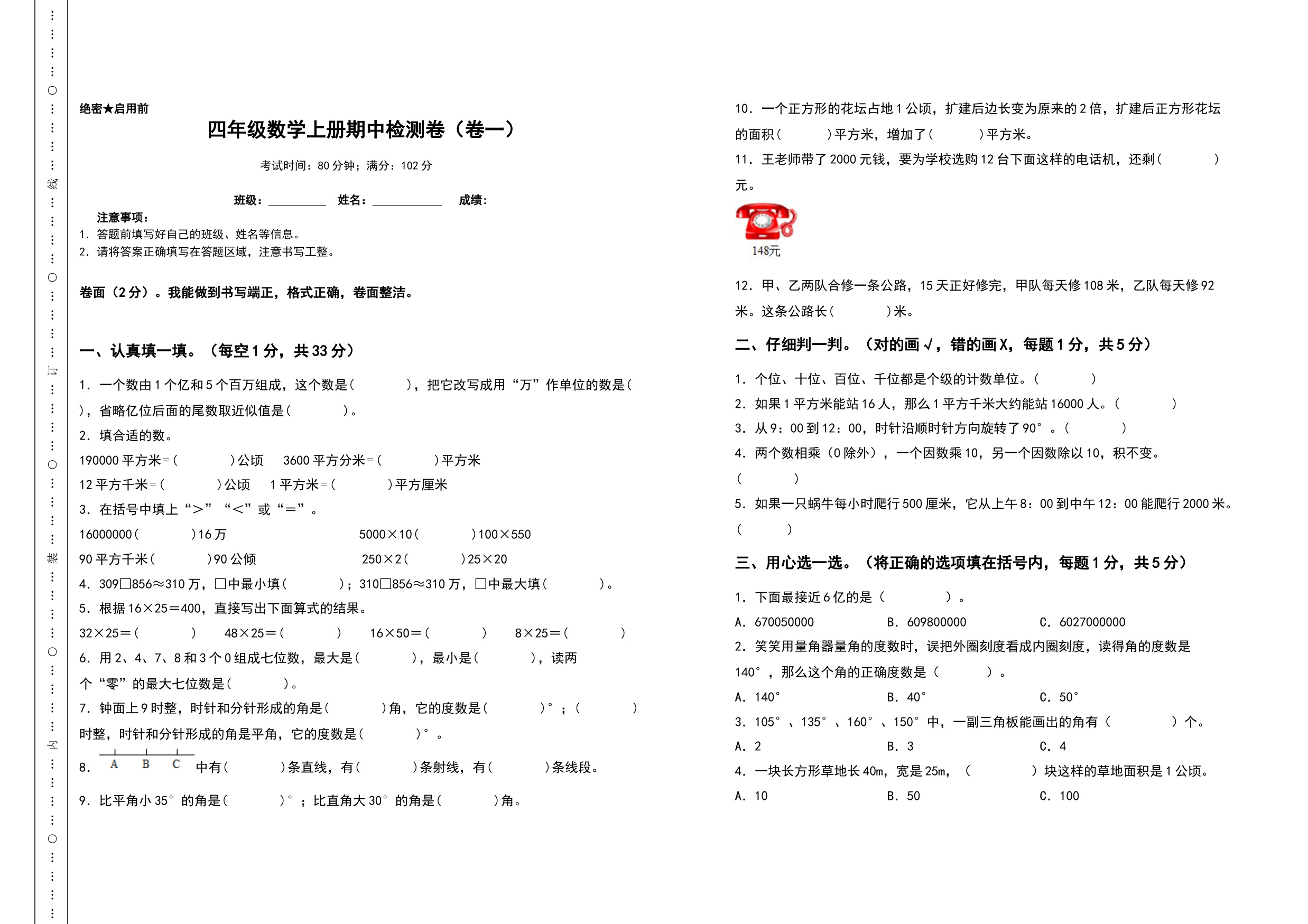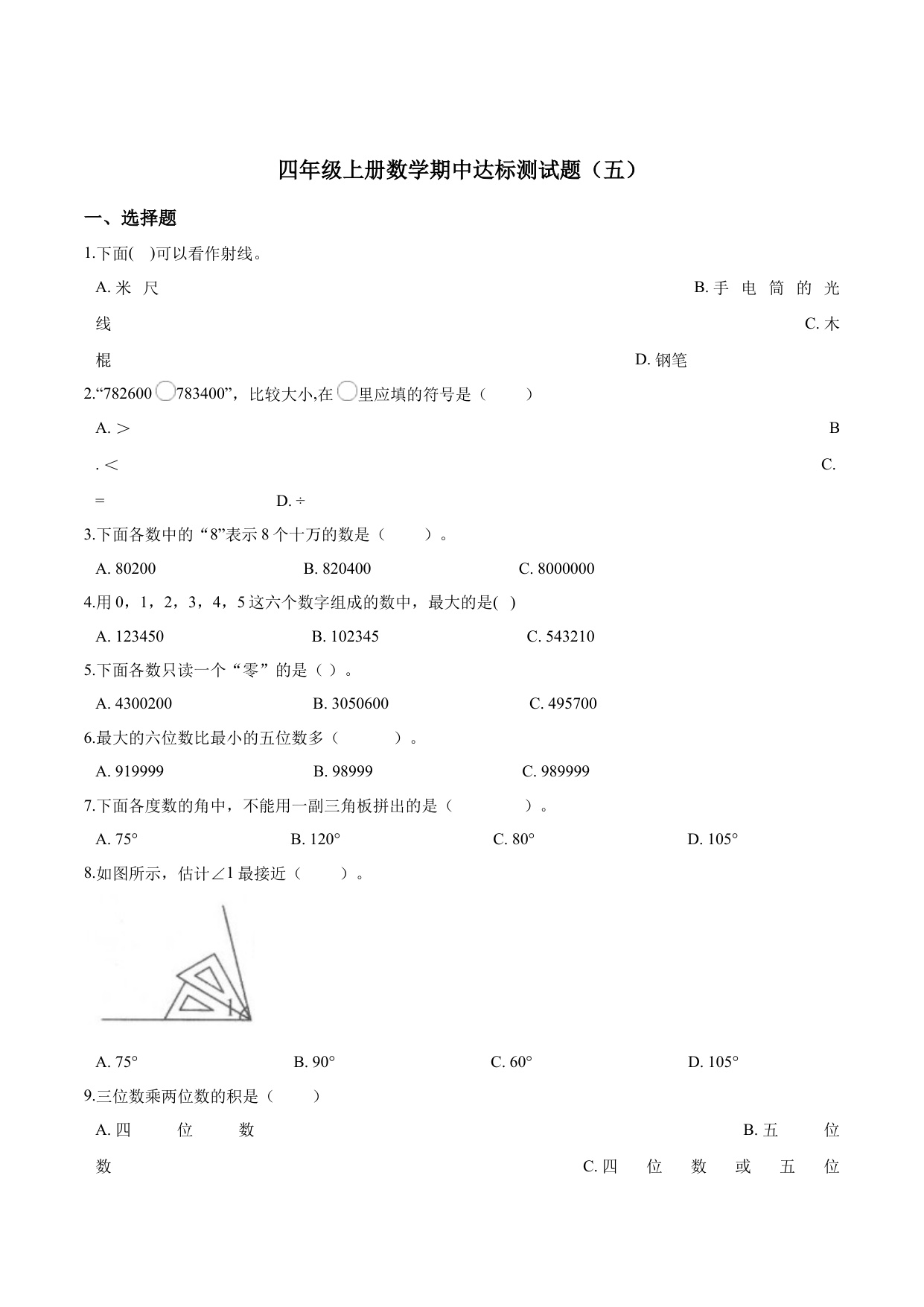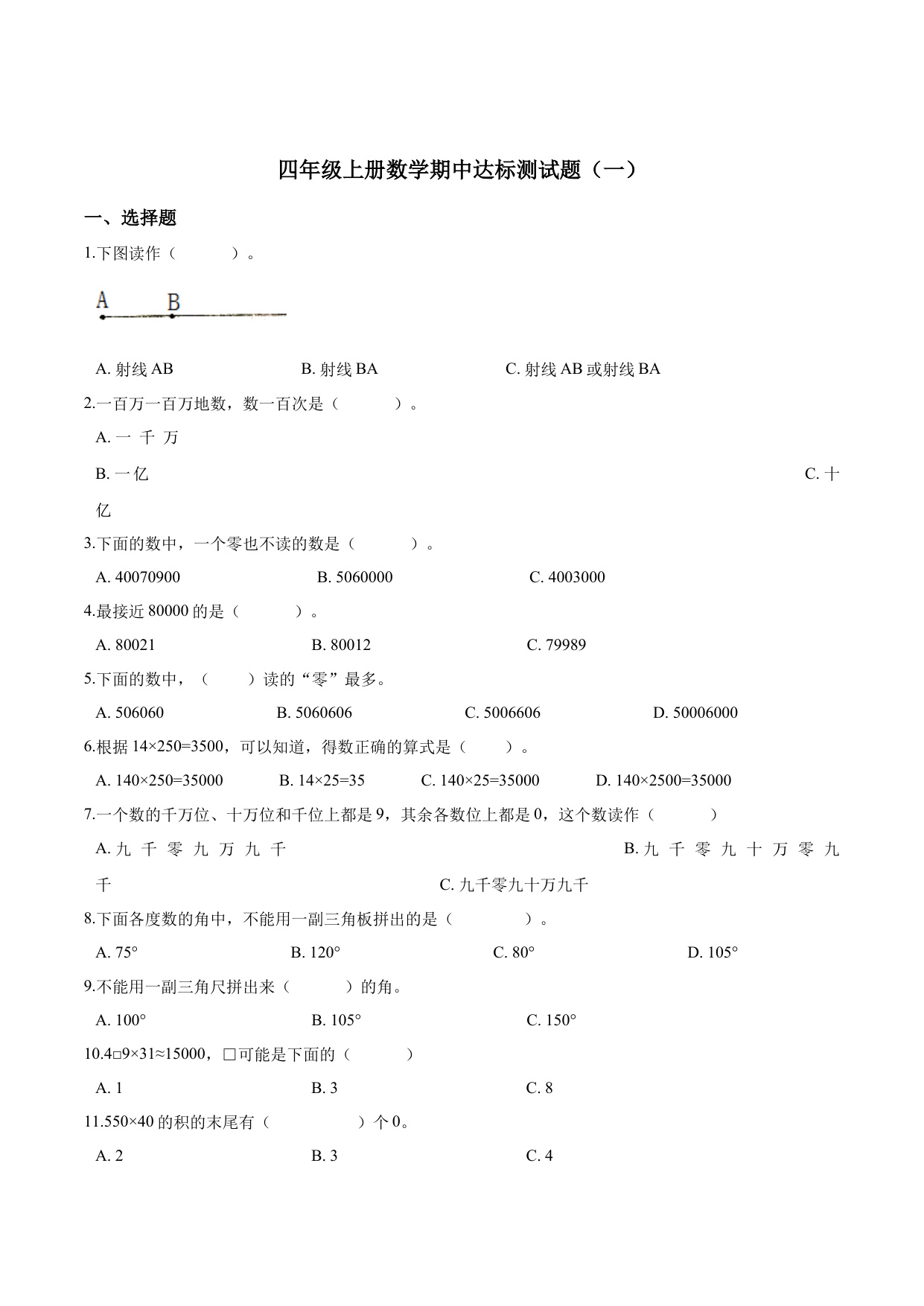 四年级数学上册期中检测卷(卷一)(含答案)人教版