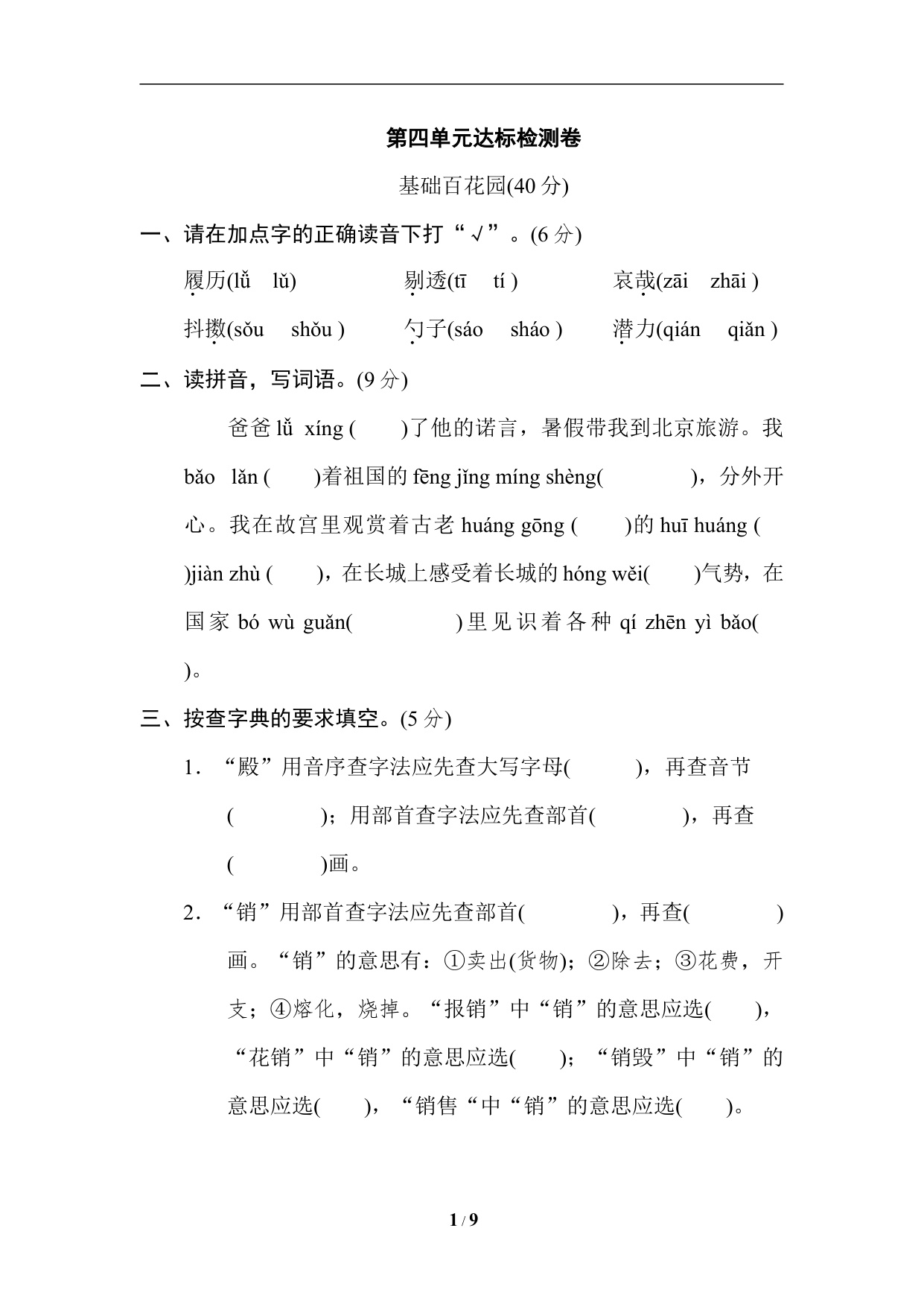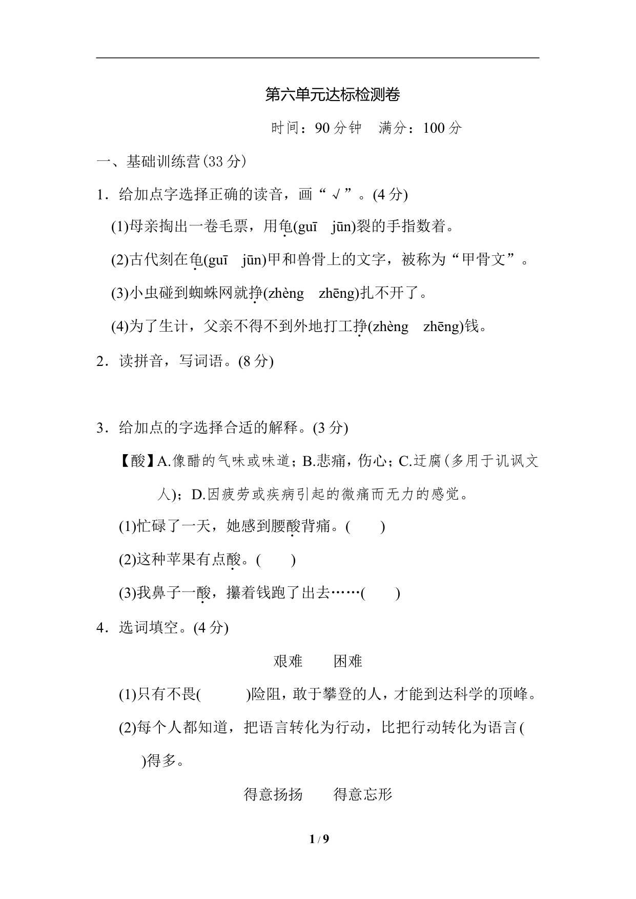 五年级上册语文第一单元达标检测卷