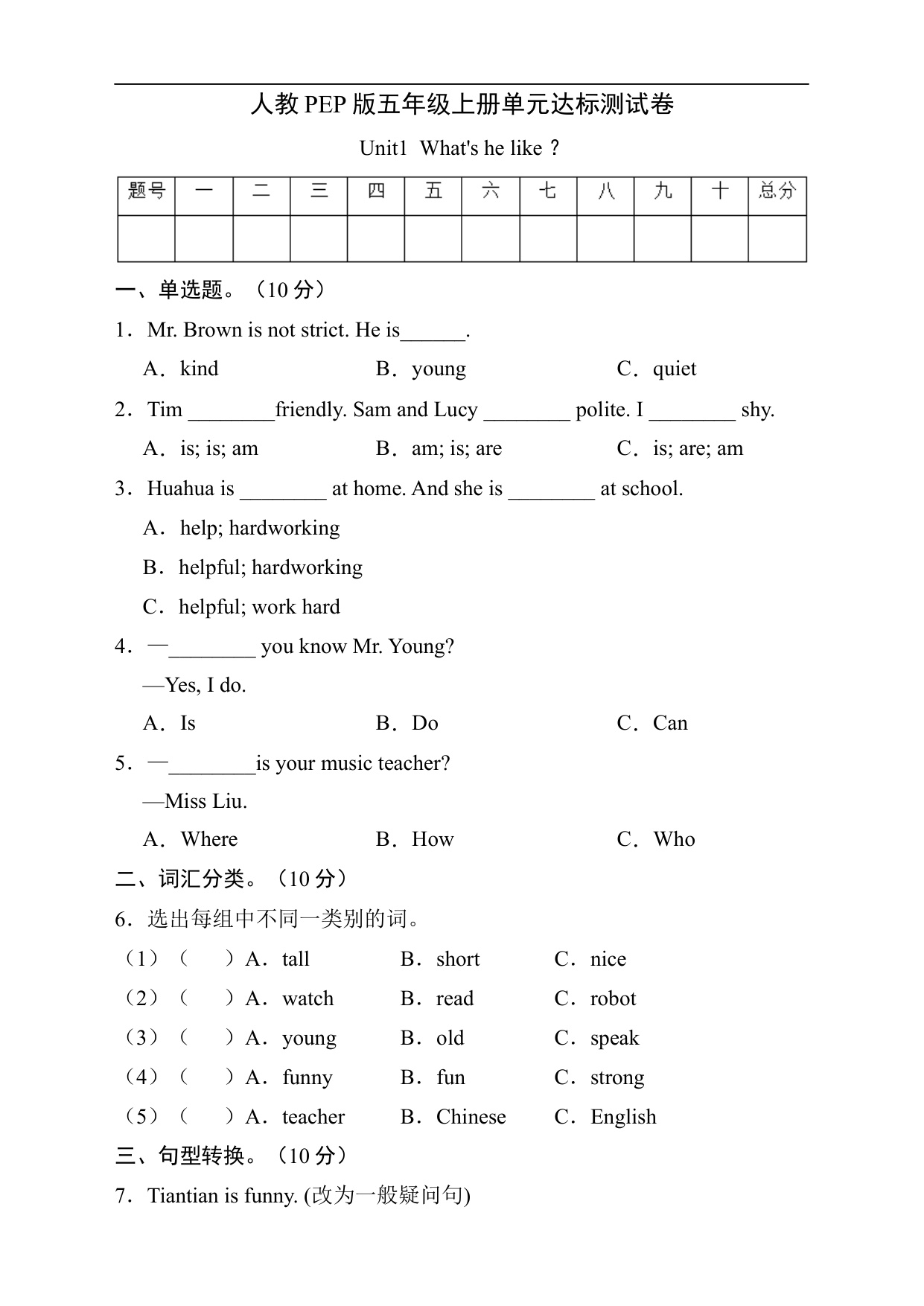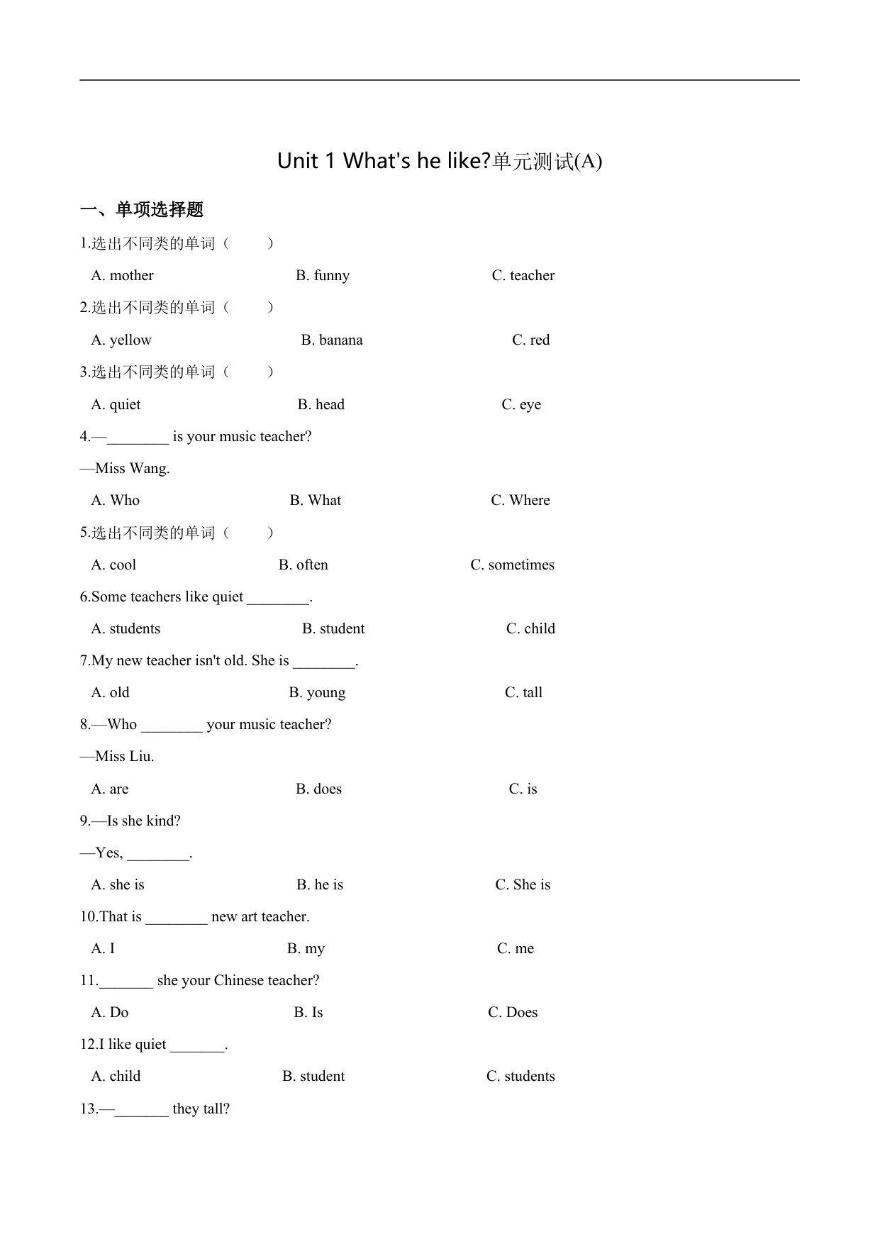 五年级上册英语第一单元过关测试(B卷) -Unit 1 What's he like 人教PEP版(含答案解析)