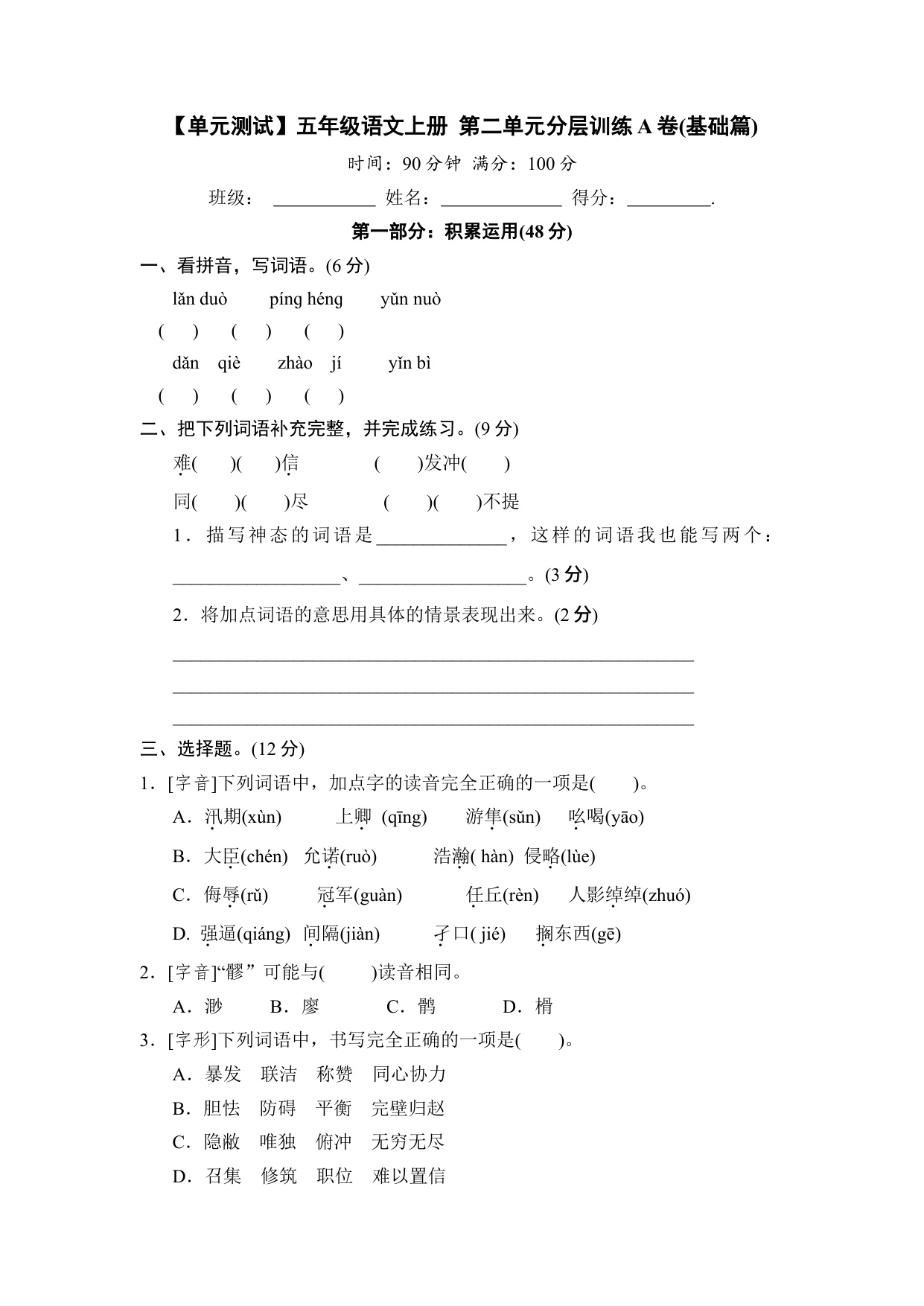 【单元测试】五年级语文上册 第二单元分层训练B卷(提升篇)【部编版 含答案】