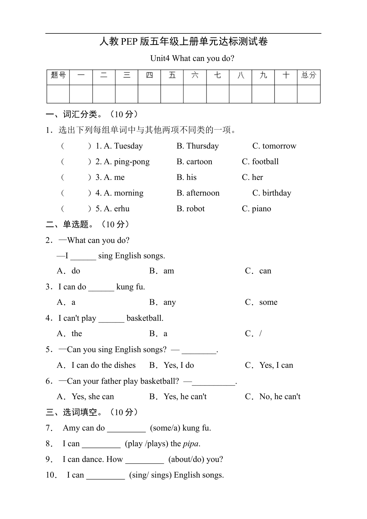 人教PEP版五年级上册单元达标测试卷 Unit 2 My week (A卷)