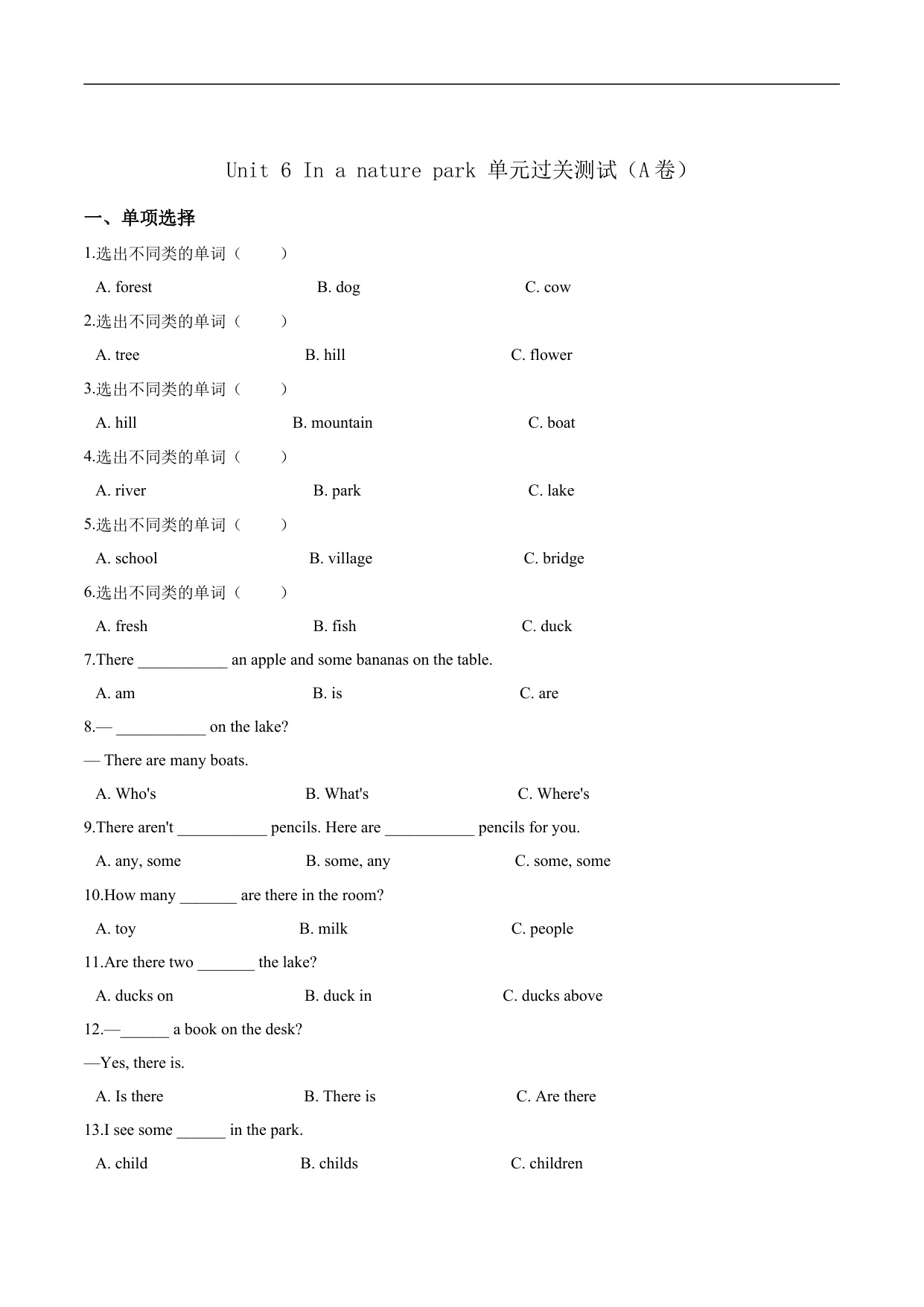 人教PEP版五年级上册单元达标测试卷 Unit 6 In a nature park(B卷)