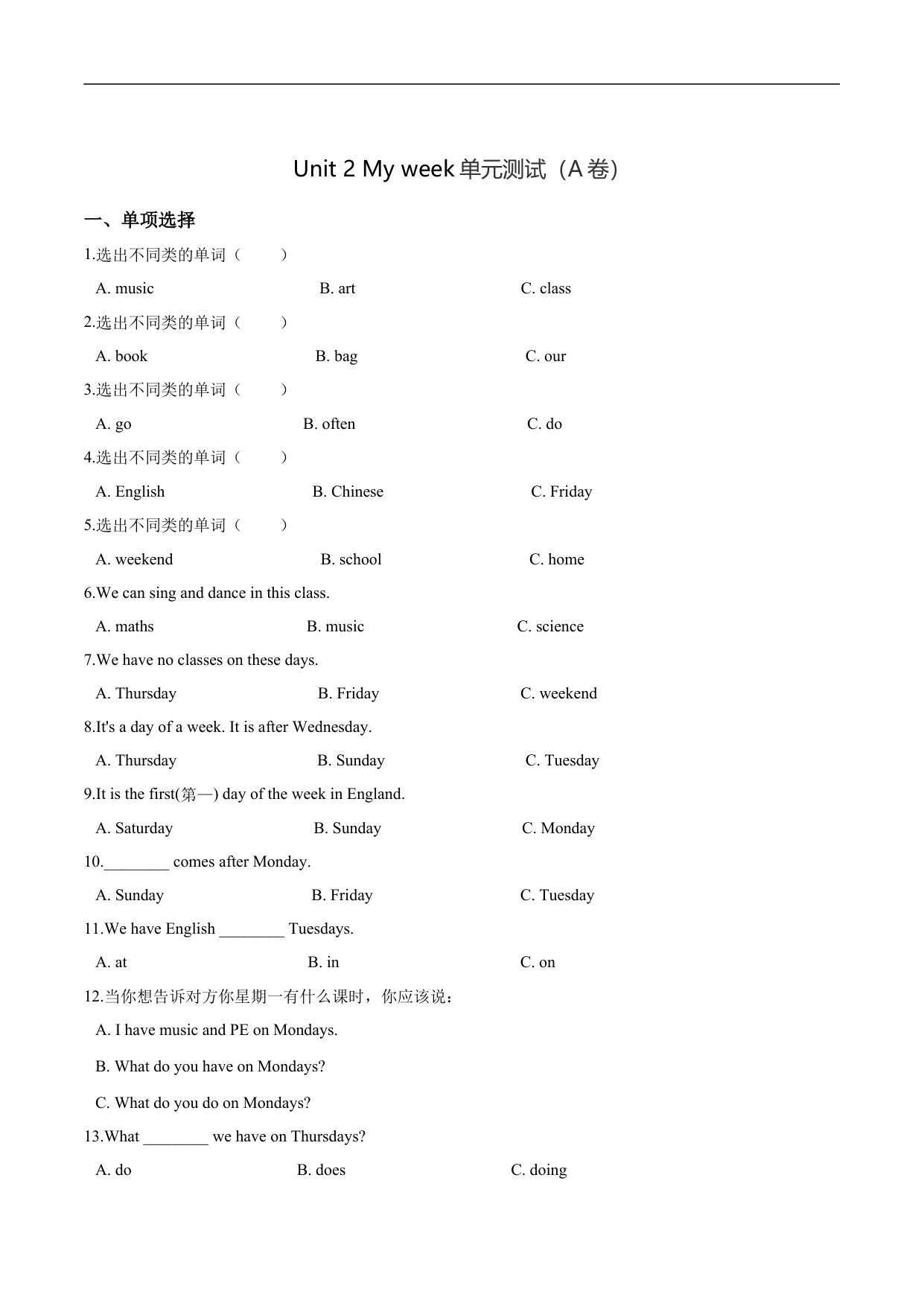 五年级上册英语第二单元过关测试(A卷) -Unit 2 My week 人教PEP版(含答案解析)