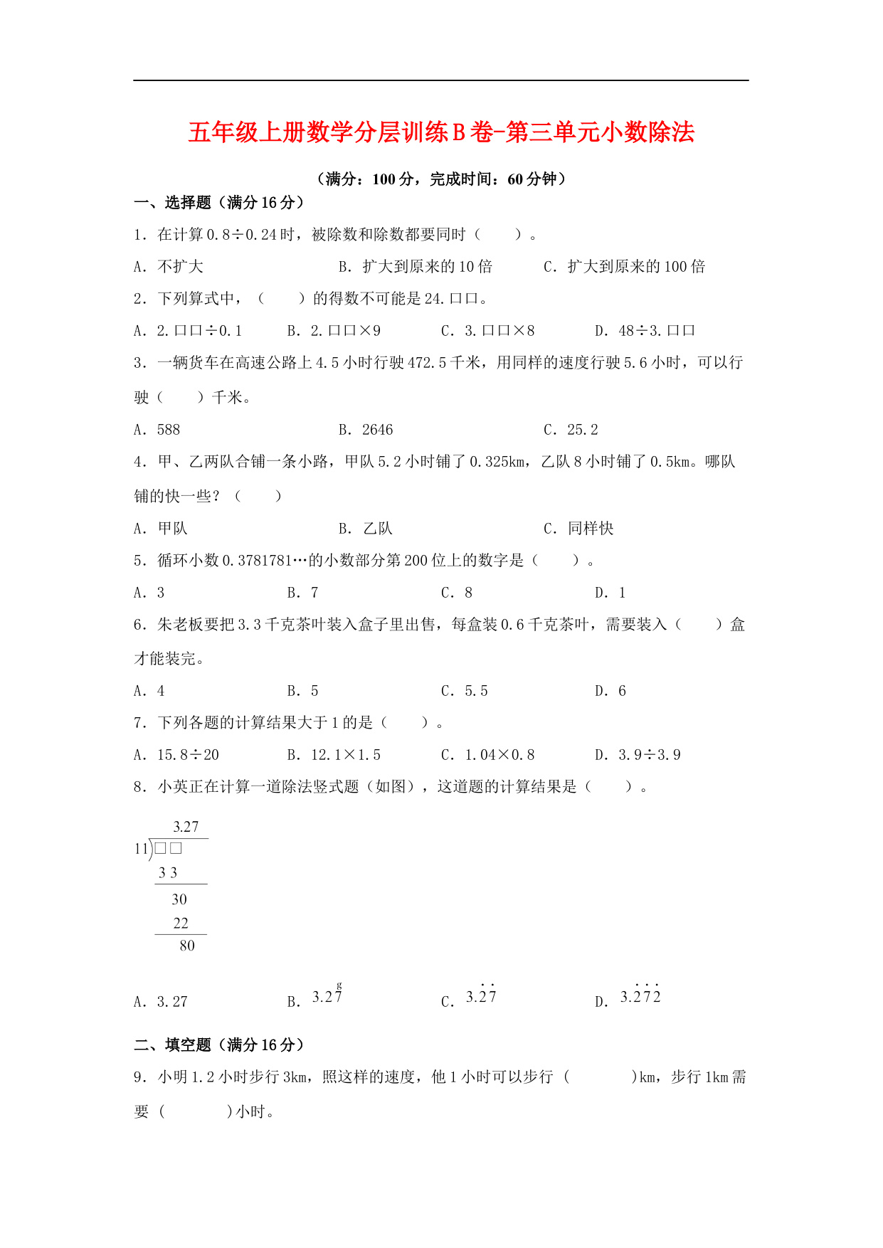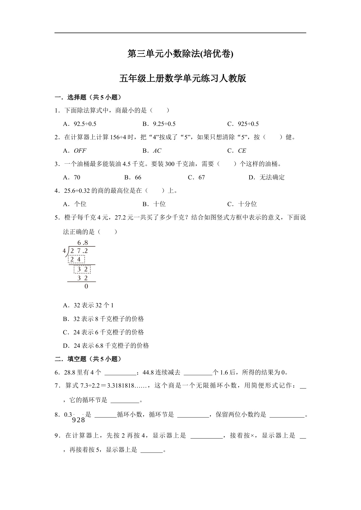 第三单元小数除法(培优卷)五年级上册数学单元练习人教版