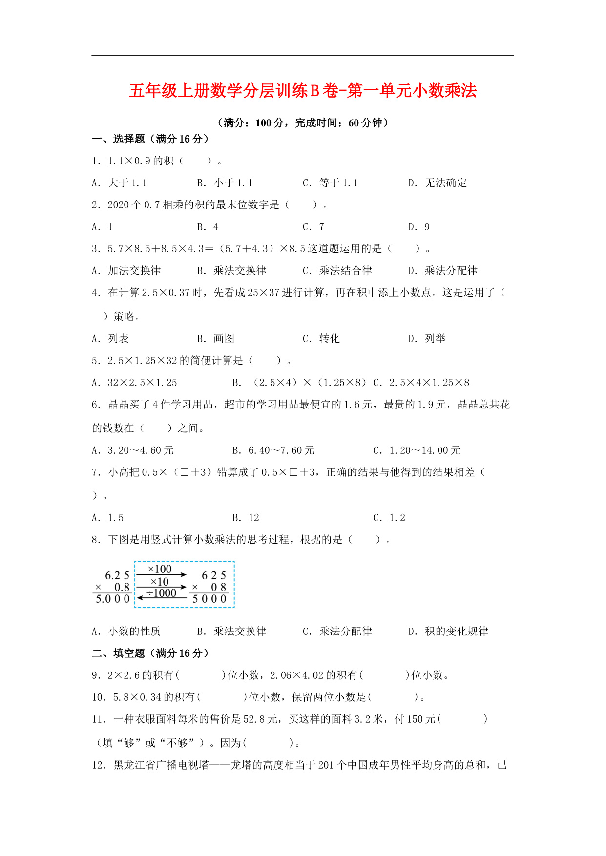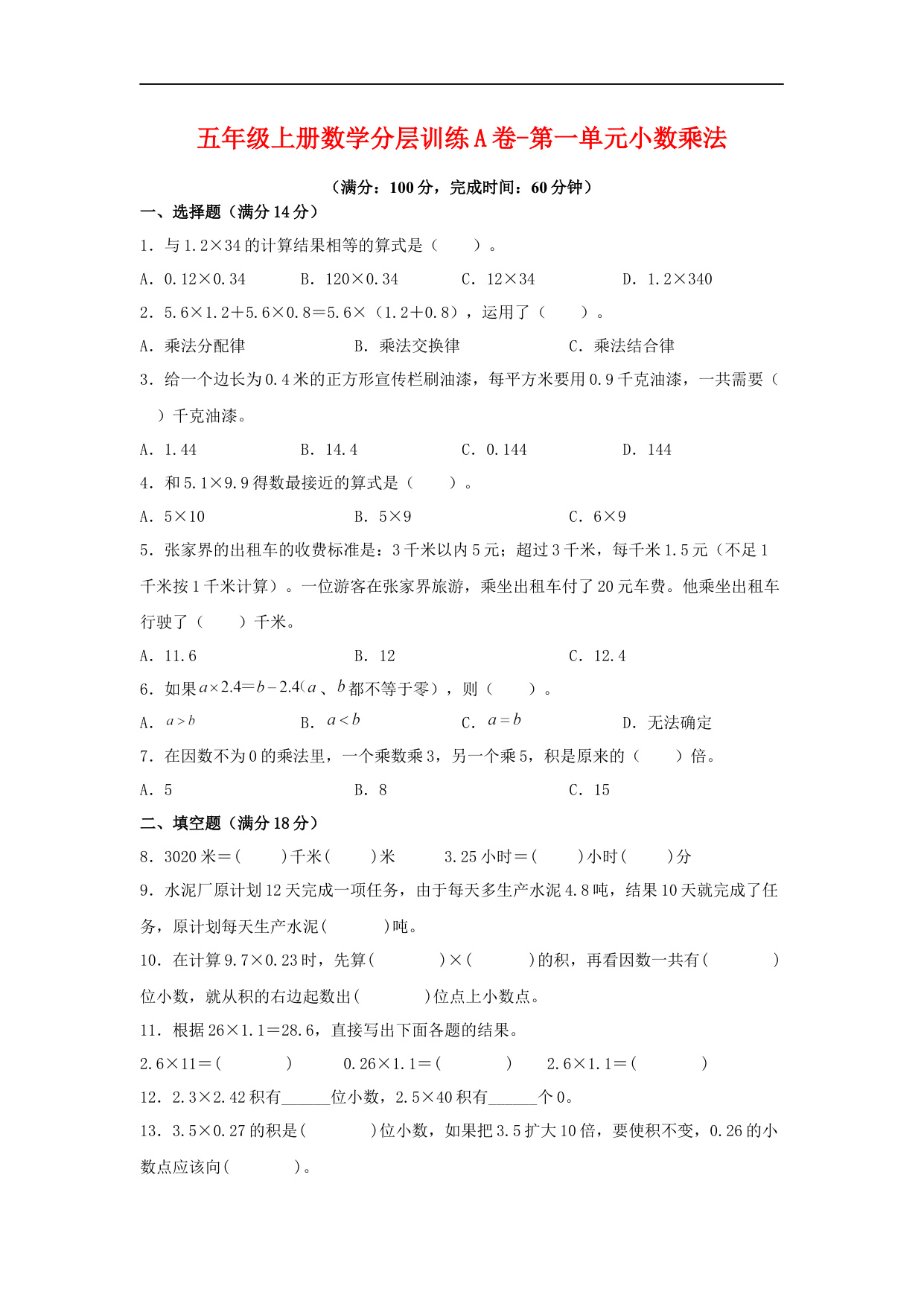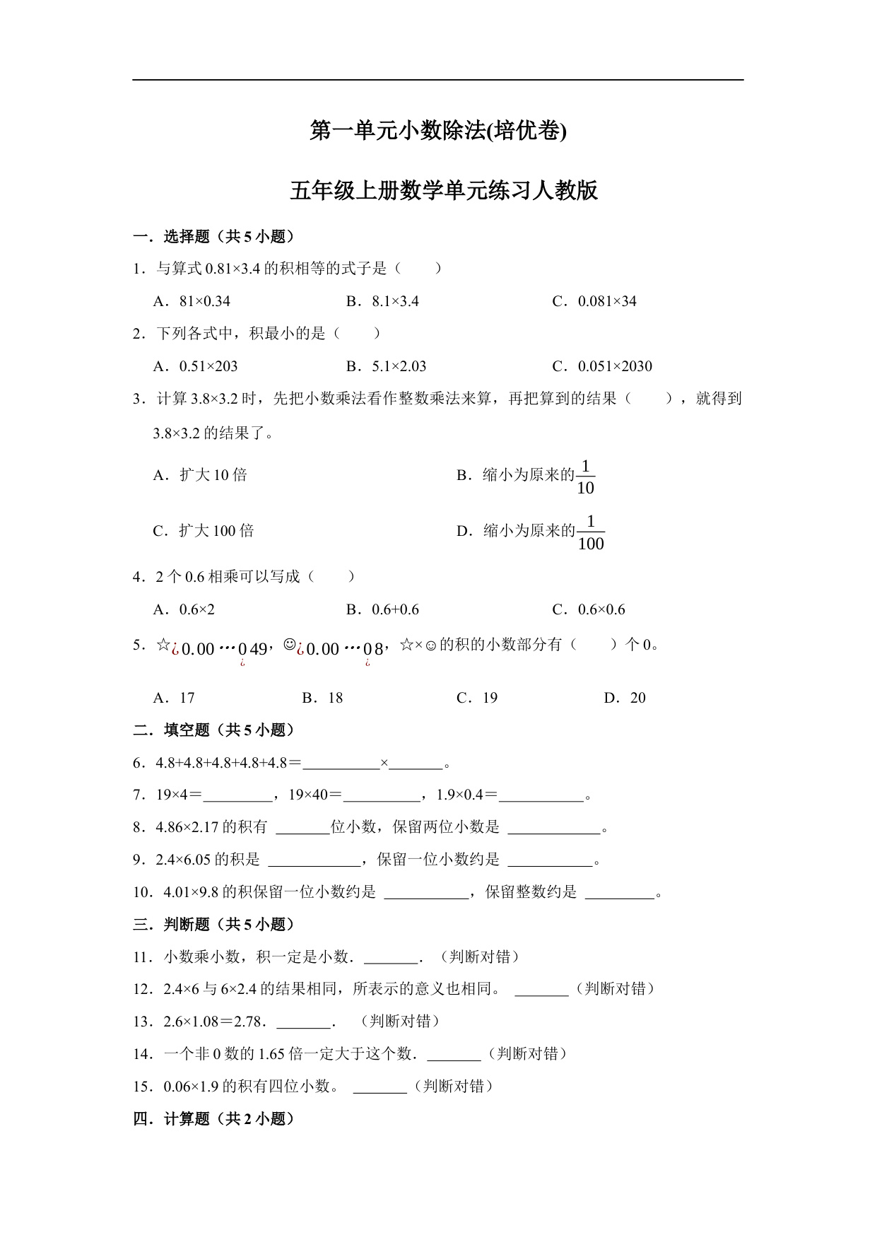 第一单元小数乘法(基础卷)五年级上册数学单元练习人教版