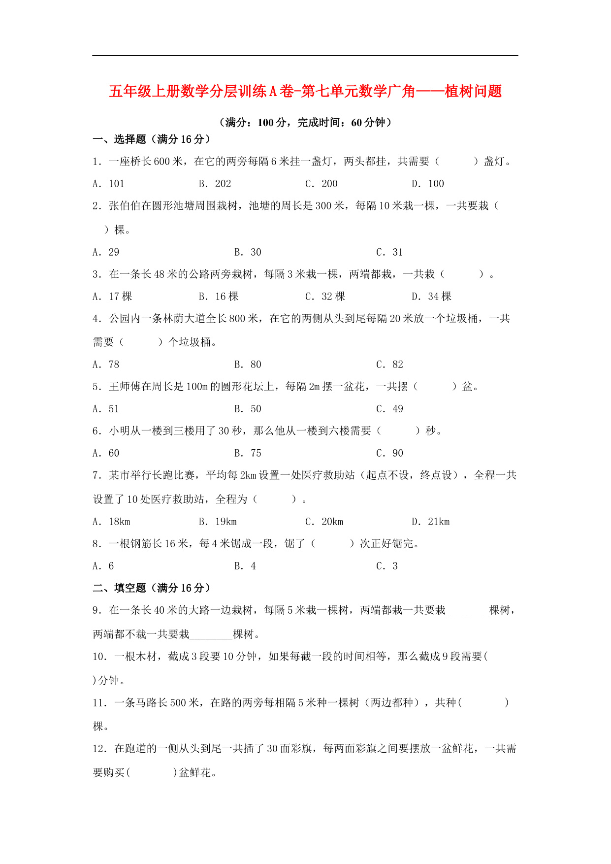 第七单元数学广角——植树问题单元练习卷(提高)- 五年级上册数学同步分层作业(人教版)