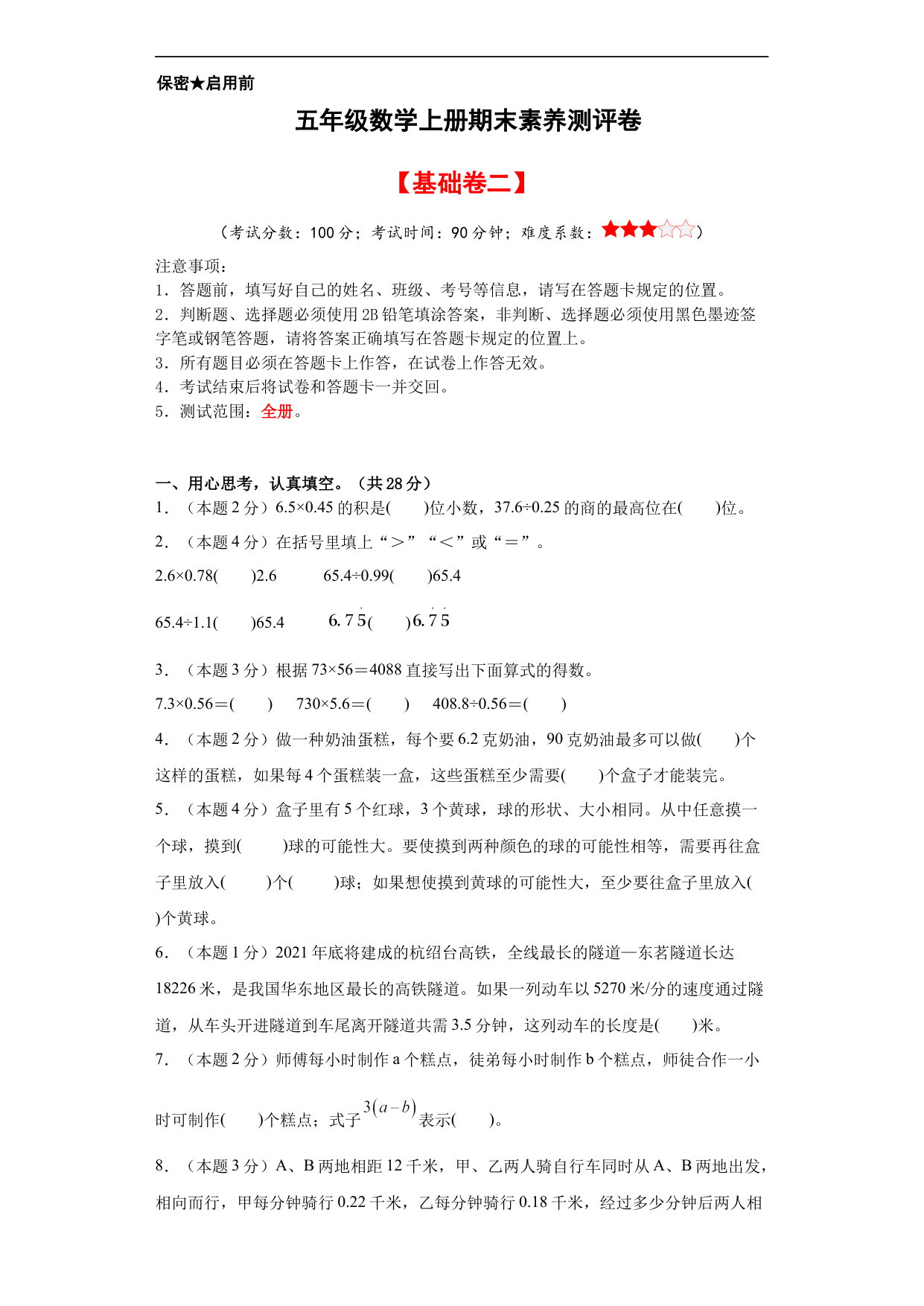 【A4原卷】五年级数学上册期末素养测评基础卷(三)