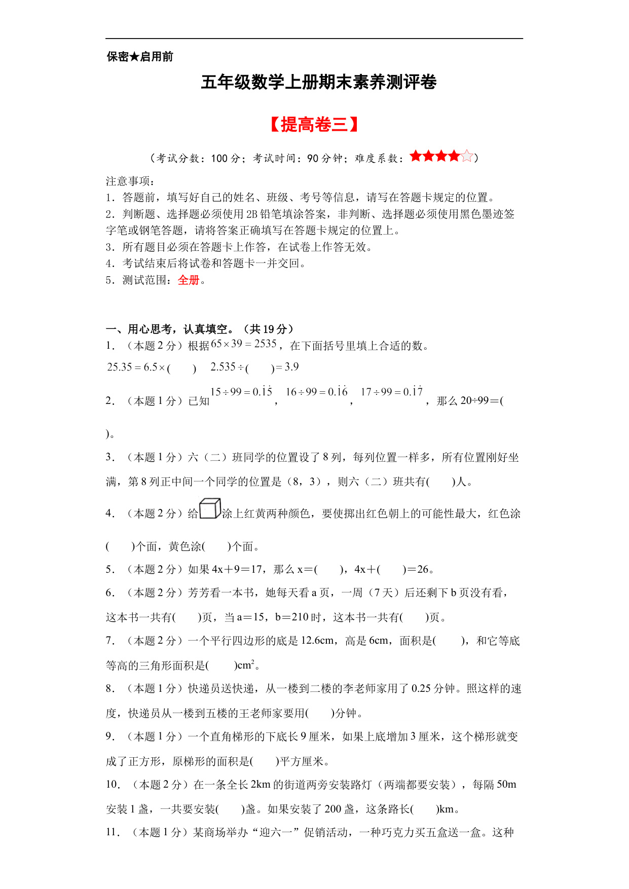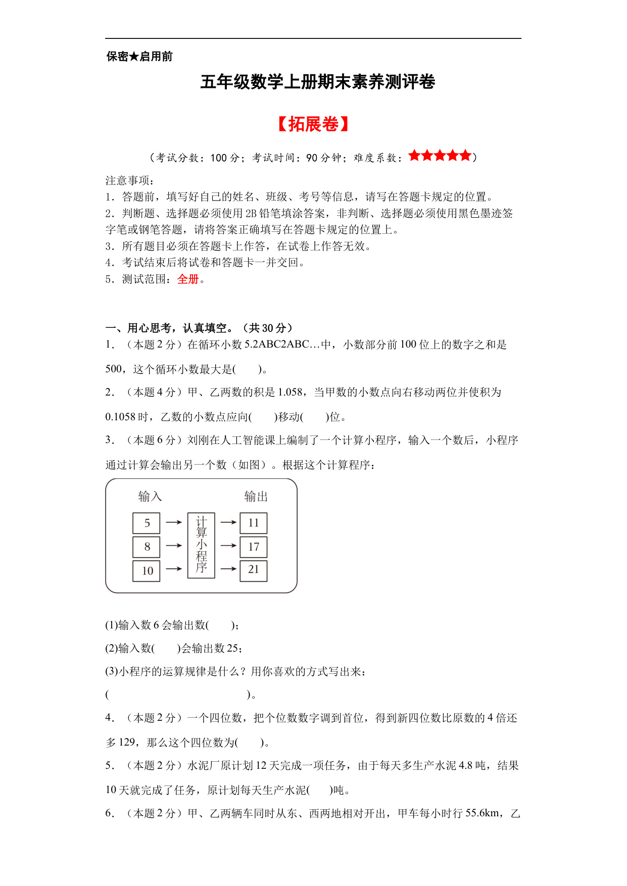 【A4原卷】五年级数学上册期末素养测评提高卷(一)