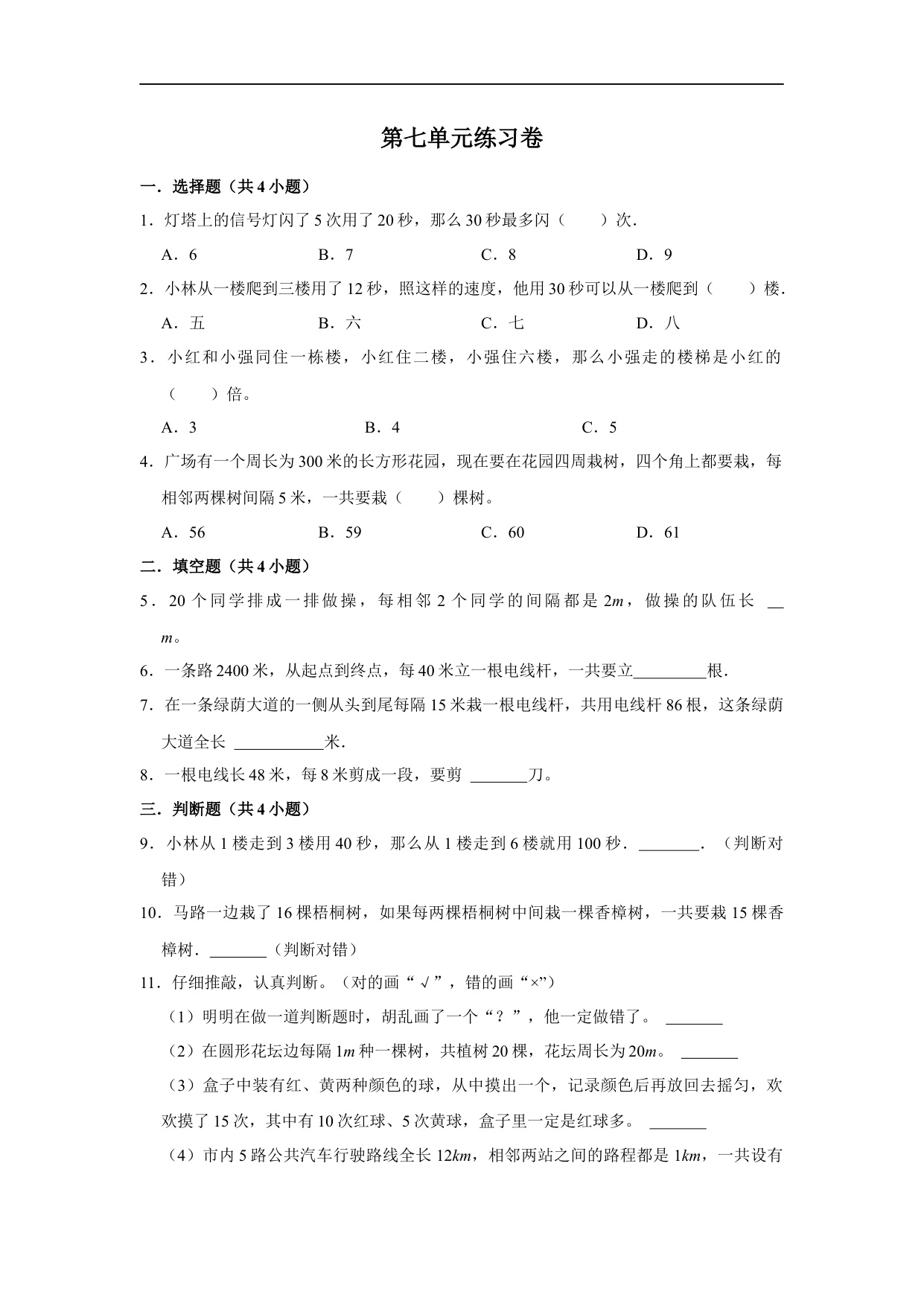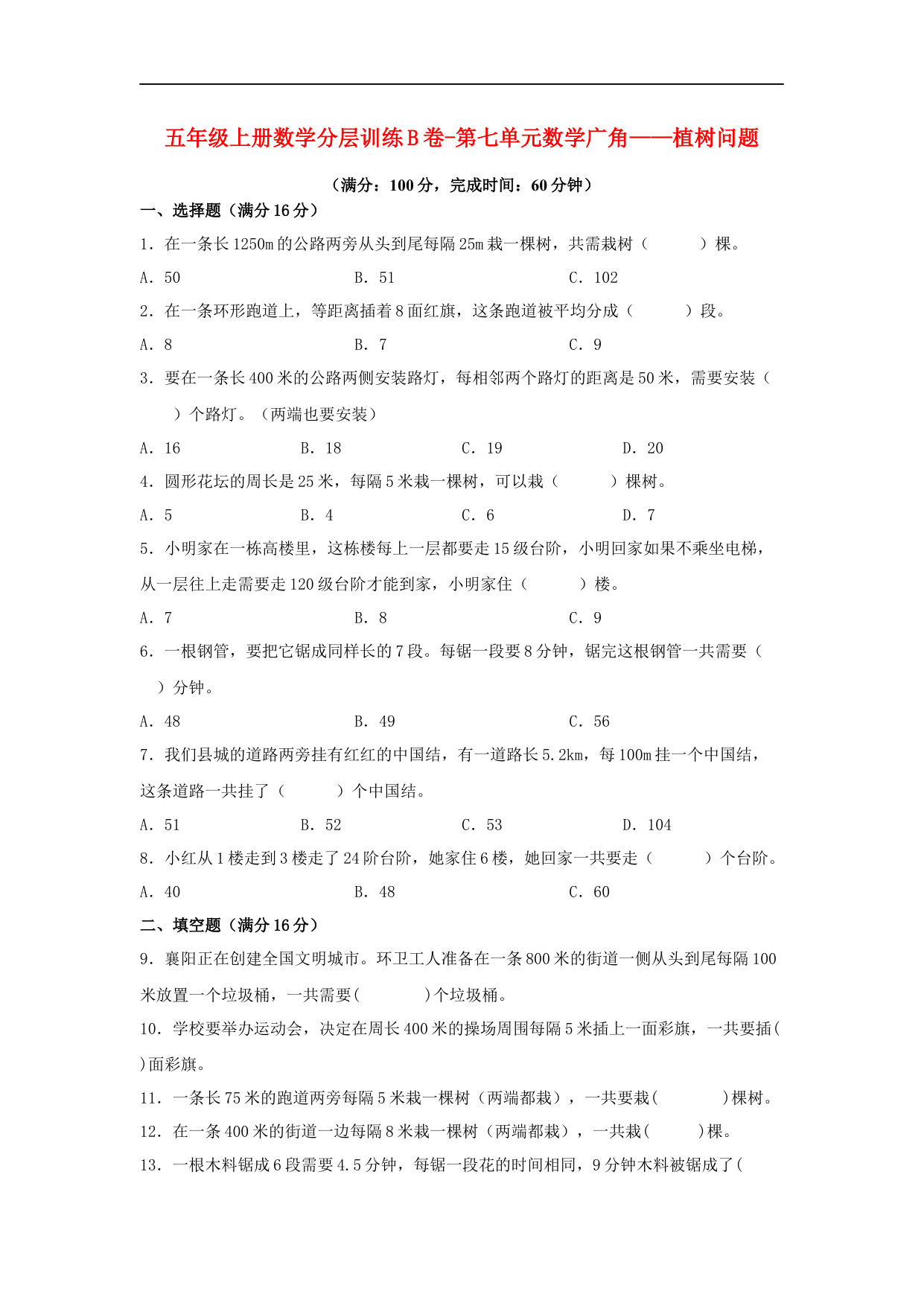 第七单元数学广角——植树问题单元测试(培优)- 五年级上册数学同步分层作业(人教版)