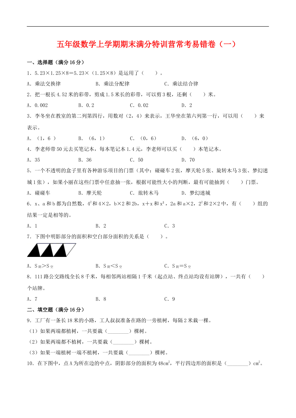 【期末必刷】五年级数学上学期期末满分特训营常考易错卷(二) 人教版(含答案)