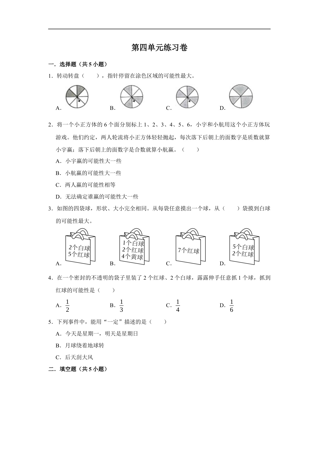 第四单元可能性单元测试(培优)- 五年级上册数学同步分层作业(人教版)