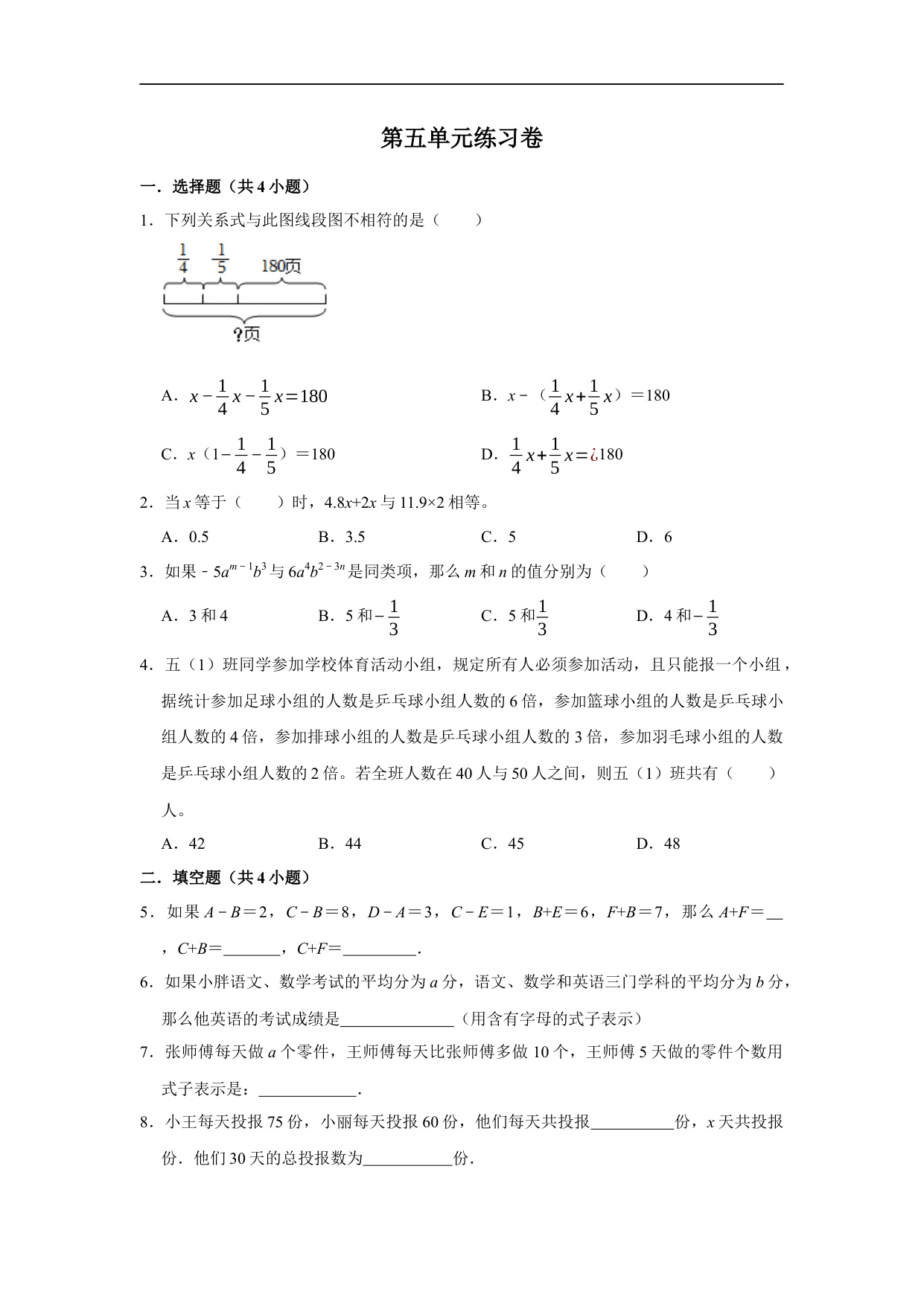 第五单元简易方程单元练习卷(提高)- 五年级上册数学同步分层作业(人教版)