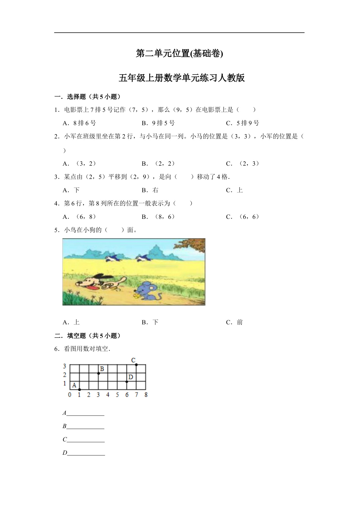 第二单元位置(基础卷)五年级上册数学单元练习人教版