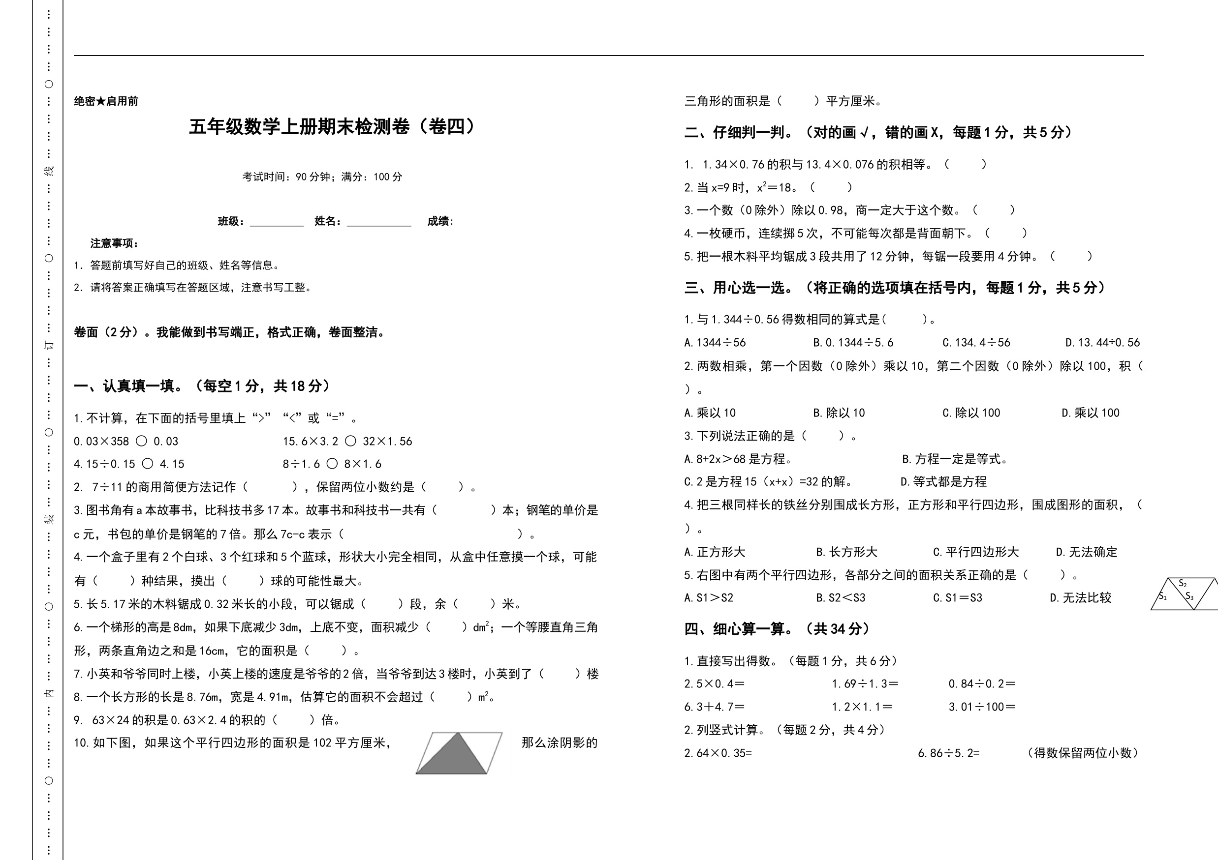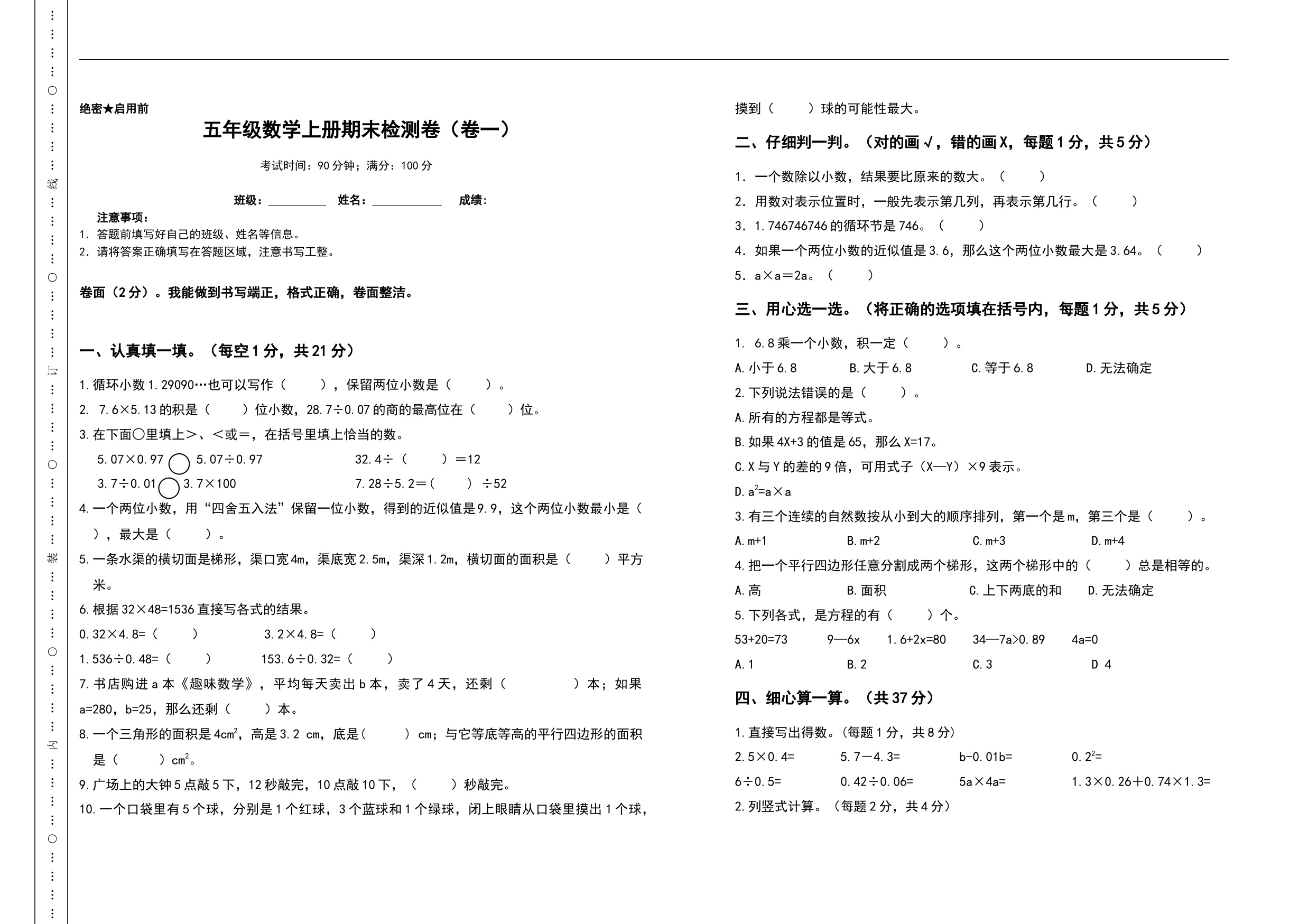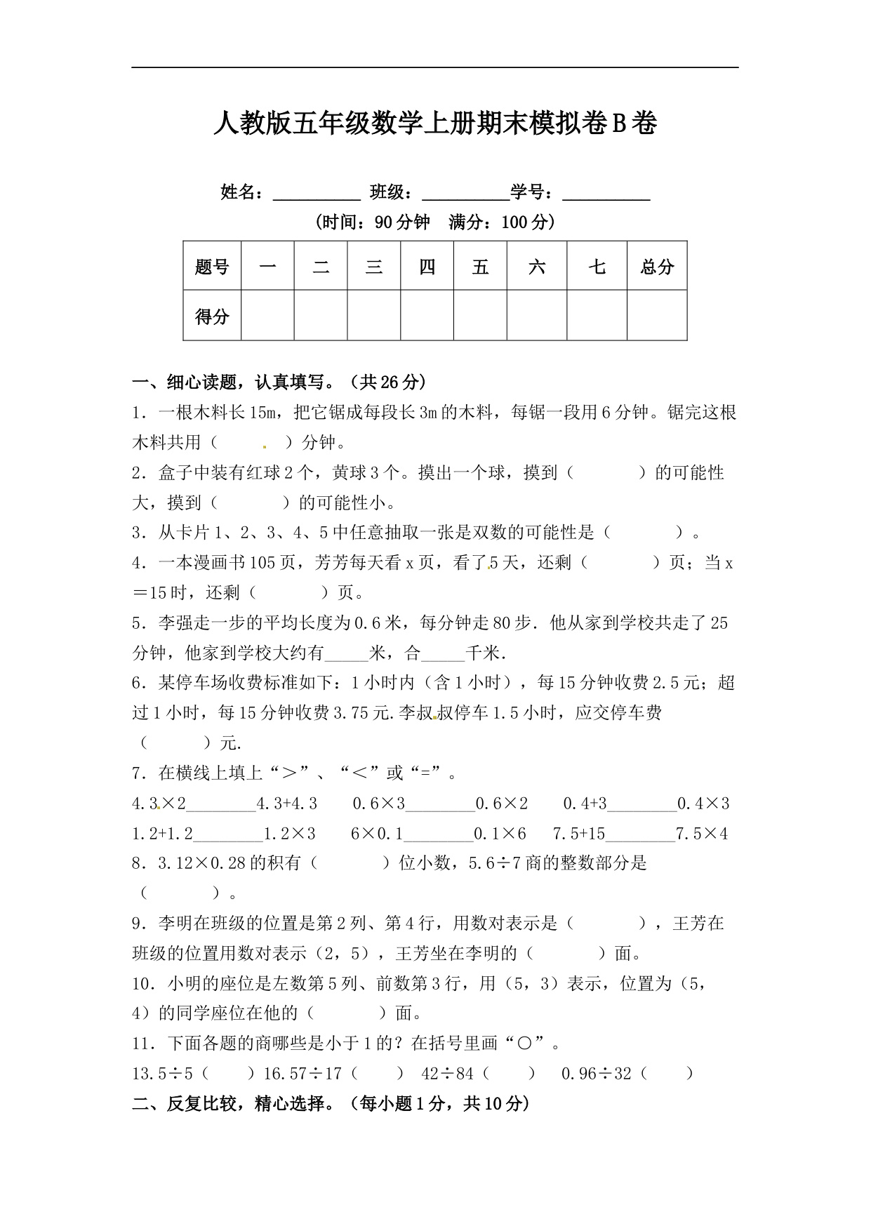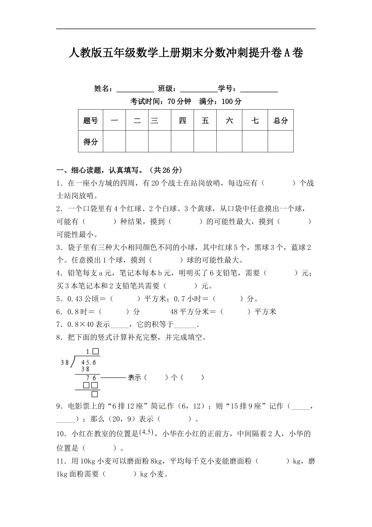 五年级第一学期数学期末测试卷(2)