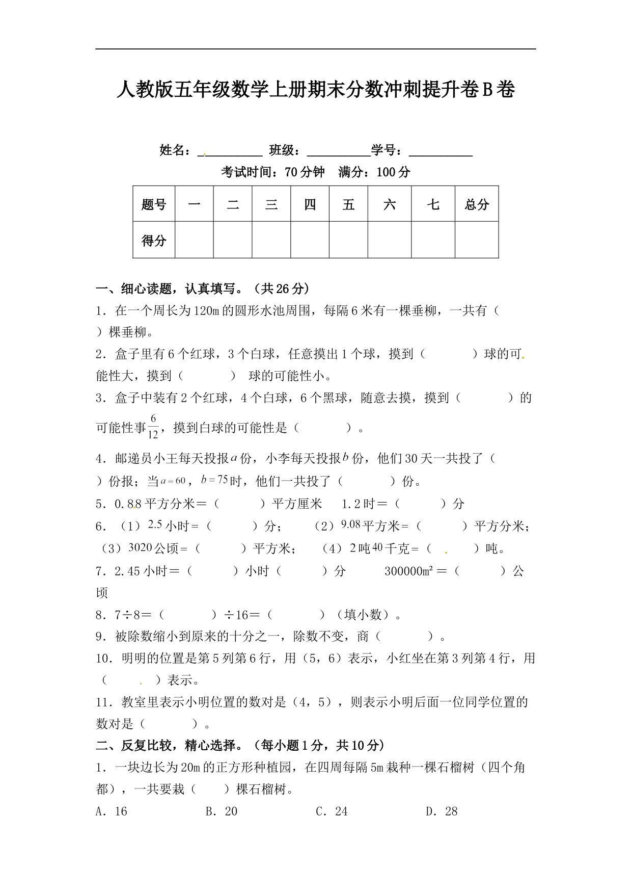 人教版五年级数学上册期末分数冲刺提升卷C卷(含答案)