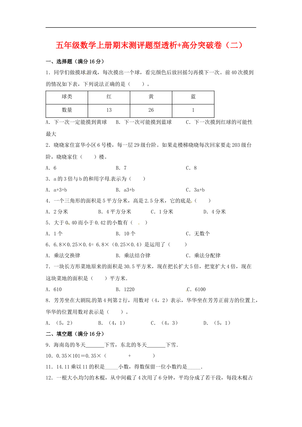 第四单元可能性单元练习卷(基础)- 五年级上册数学同步分层作业(人教版)