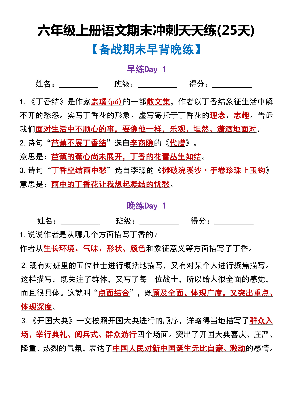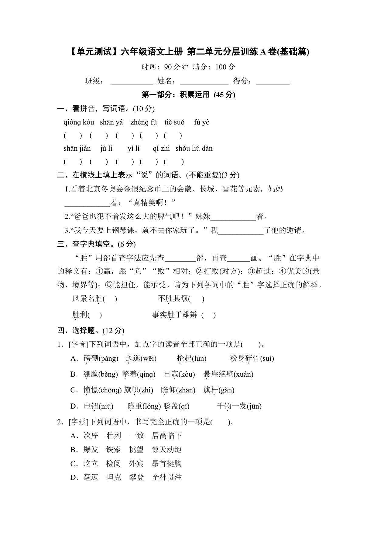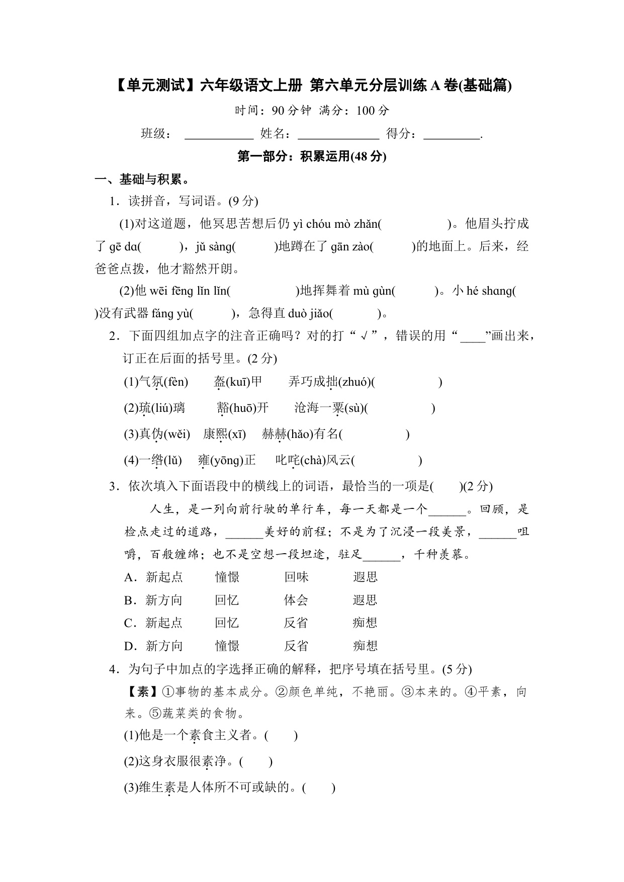 【单元测试】六年级语文上册 第一单元分层训练A卷(基础篇)【部编版 含答案】