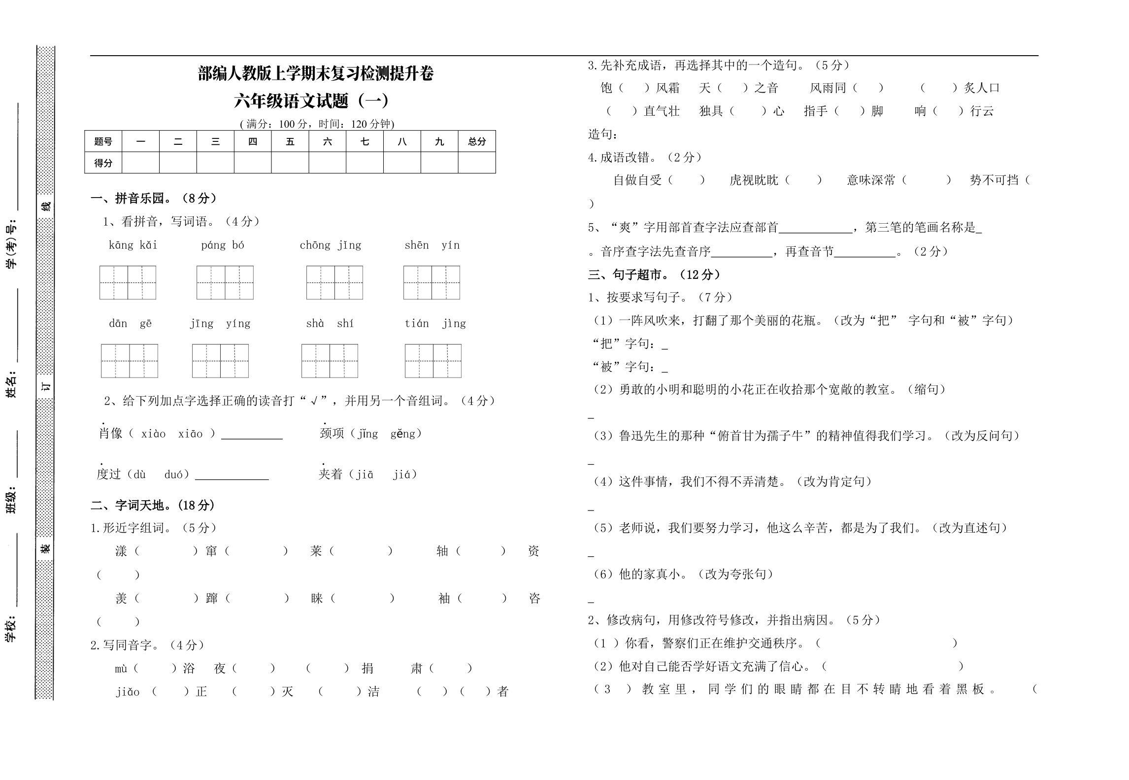 01 六年级语文上册期末教学质量检测试卷(含答案)部编版