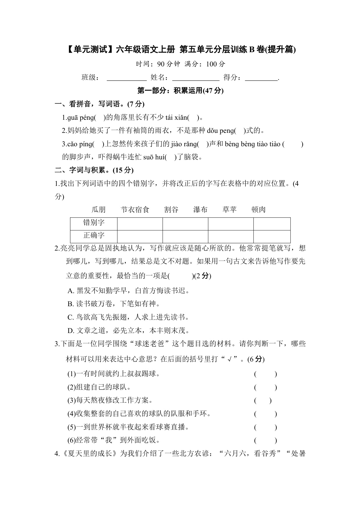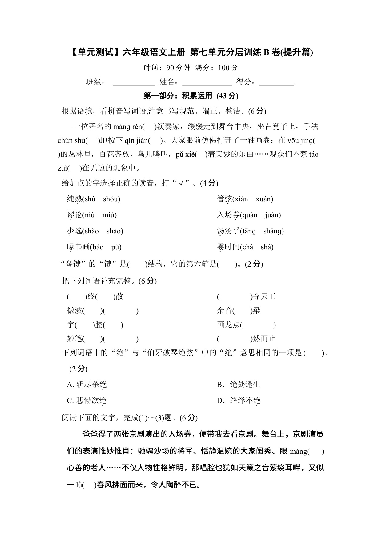 【单元测试】六年级语文上册 第一单元分层训练B卷(提升篇)【部编版 含答案】