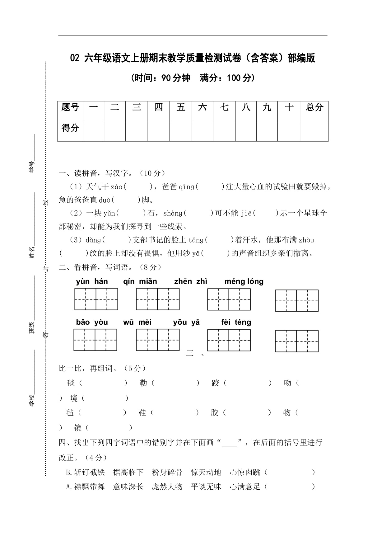 02 六年级语文上册期末教学质量检测试卷(含答案)部编版